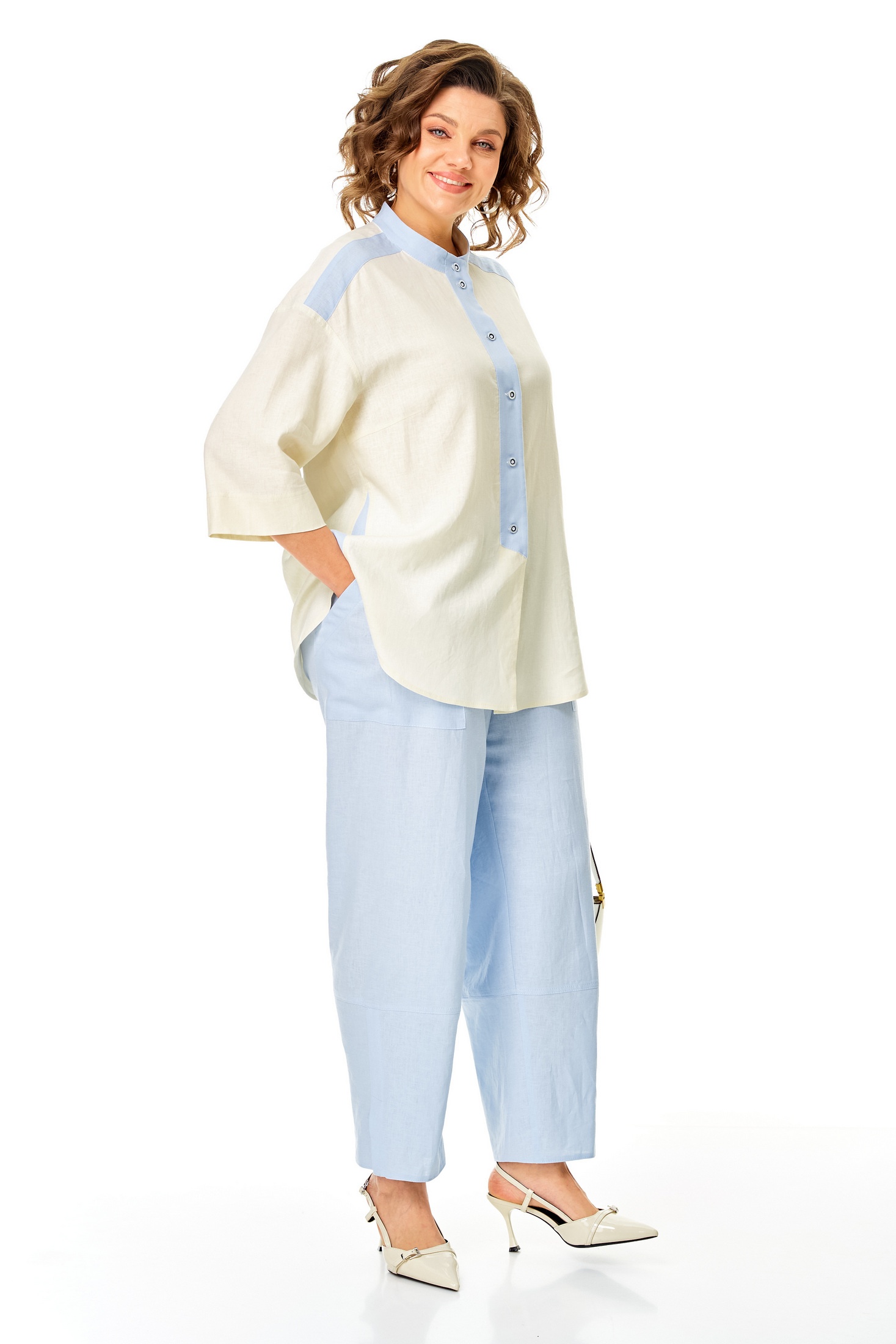 Костюм брючный 26242 молочно-голубой DOGGI. Коллекция бренда DOGGI предлагает легкий, стильный и комфортный костюм из натуральных материалов с высоким содержанием льна и вискозы. Блузон свободного кроя с контрастной отделкой и воротником-стойкой придаст вашему образу особый шарм. Спущенный рукав и фигурный низ добавляют изысканности. Брюки модного кроя баги с резинкой и декорированными подрезами по низу гарантируют комфорт. Наличие карманов позволяет сохранять практичность в повседневном использовании. Данный брючный костюм, выполненный в молочно-голубой цветовой гамме, станет идеальным выбором для весенне-летнего сезона, подчеркивая стиль и комфорт в любом событии.