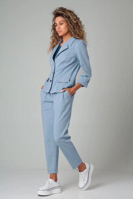 Стильный брючный костюм 2-ка. Жакет полуприлегающего силуэта, застежка на 3 пуговицы. Функциональные накладные карманы. Рукав три четверти с отворотом. Жакет без подкладки. Брюки свободного силуэта из текстильной ткани с карманами, средней посадки на поясе- обтачке со шлевками, застежка молния спереди. Длина жакета 57 см, рукав 53 см. Длина брюк 96 см. Длина топа 56 см, рукав 17 см.
