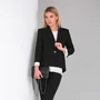 Стильный брючный костюм 2-ка. Жакет полуприлегающего силуэта, застежка на 3 пуговицы. Функциональные накладные карманы. Рукав три четверти с отворотом. Жакет без подкладки. Брюки свободного силуэта из текстильной ткани с карманами, средней посадки на поясе- обтачке со шлевками, застежка молния спереди. Длина жакета 57 см, рукав 53 см. Длина брюк 96 см. Длина топа 56 см, рукав 17 см.