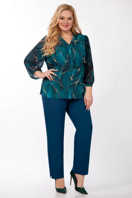 Универсальная базовая блузка прямого силуэта из легкой принтованной ткани. По переду вытачки нагрудные. Вырез горловины V-образный, не глубокий, параллельно переходящий в настрочную планку. Рукав втачной, из креп-шифона, низ обработан притачной манжетой. В боковых швах предусмотрены фигурные разрезы. Брюки слегка зауженные к низу, оформлены притачным поясом, застежка молния + пуговица.