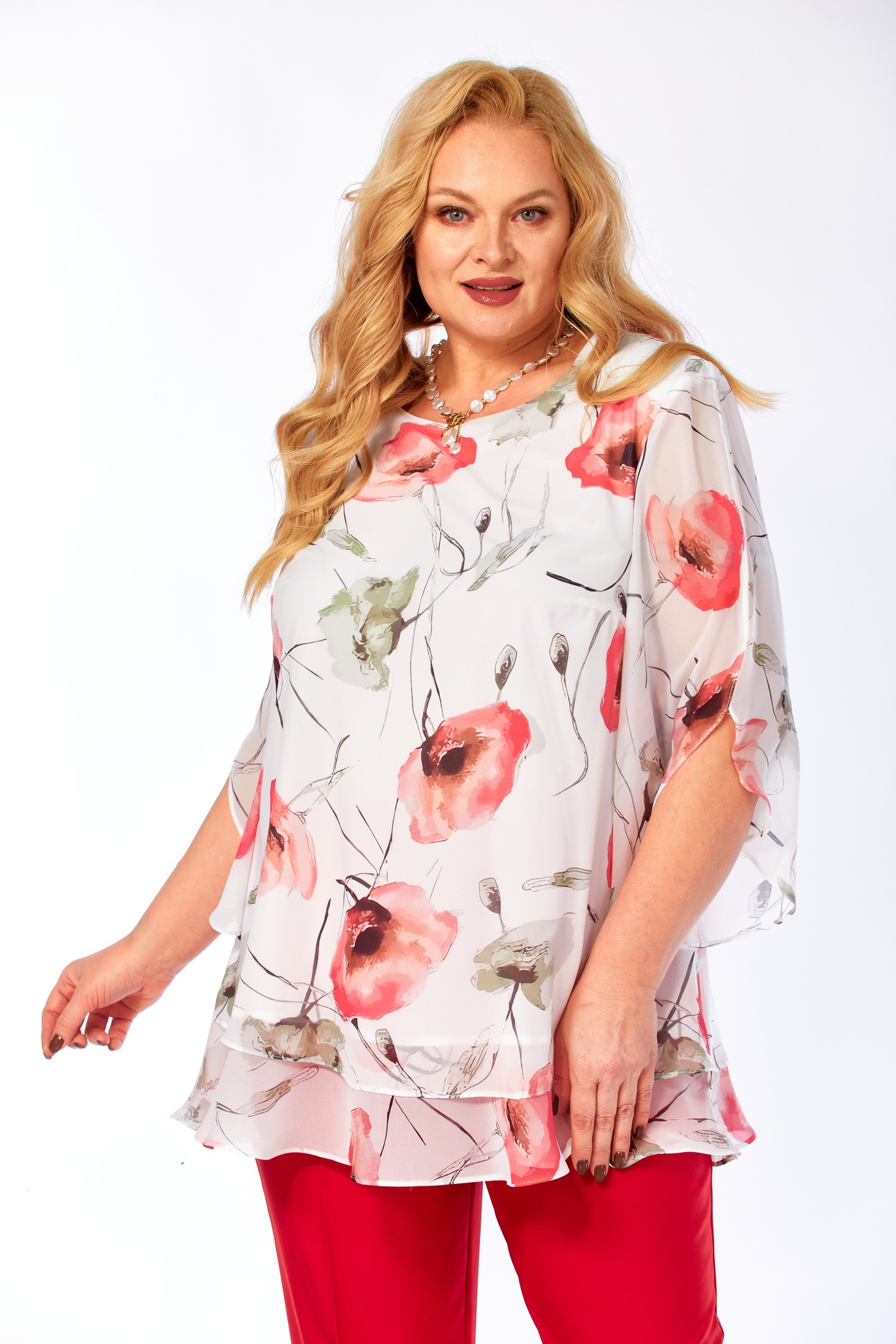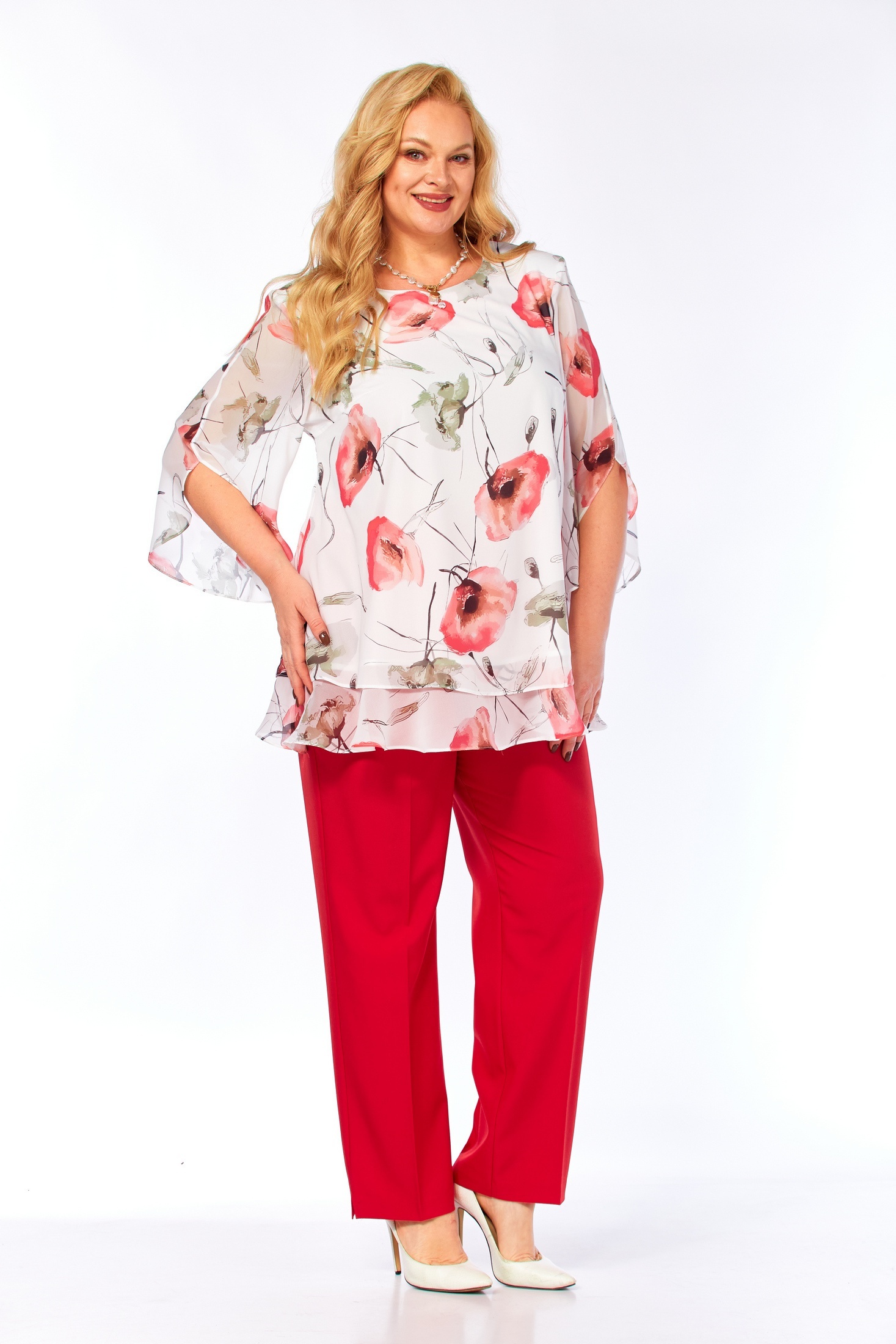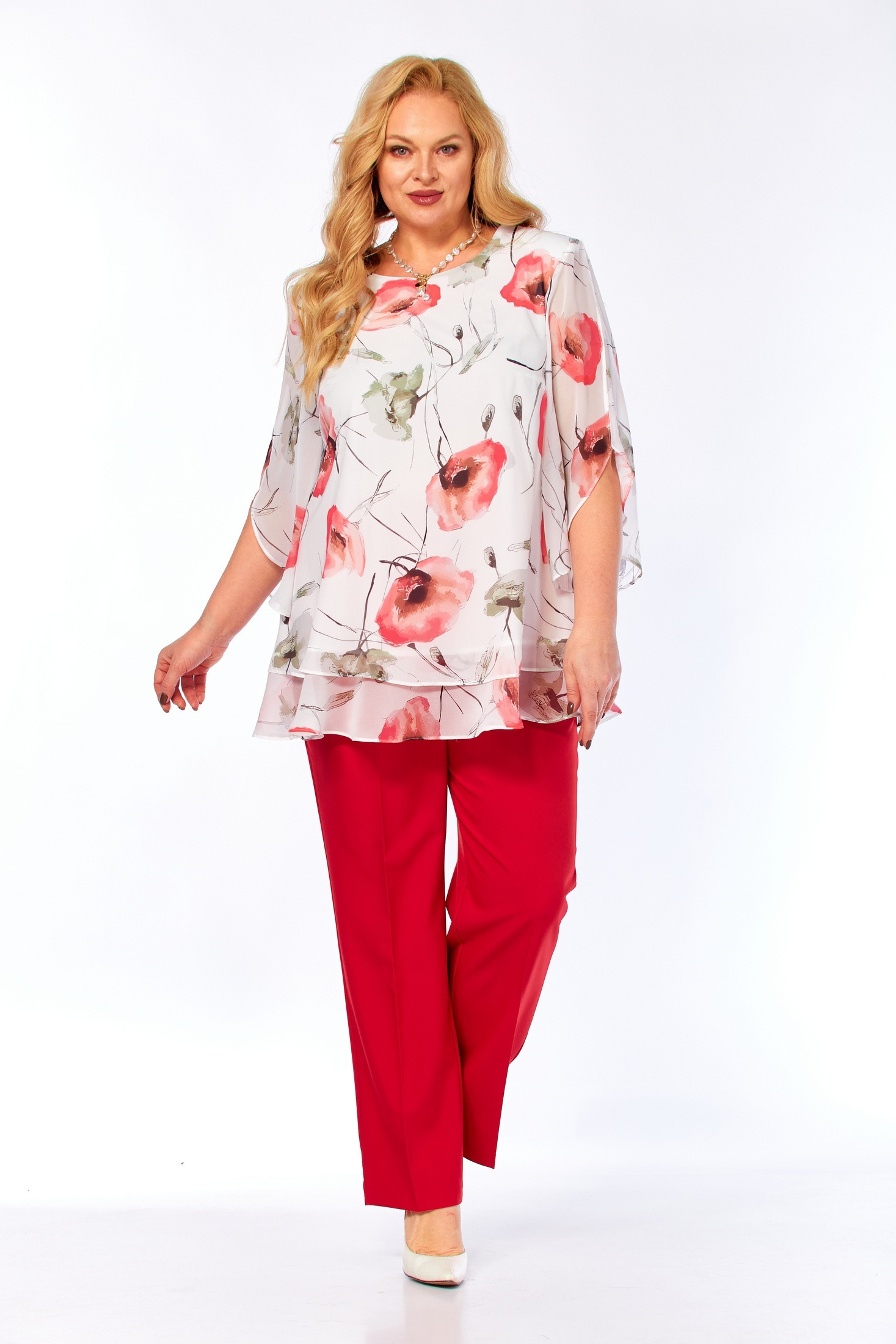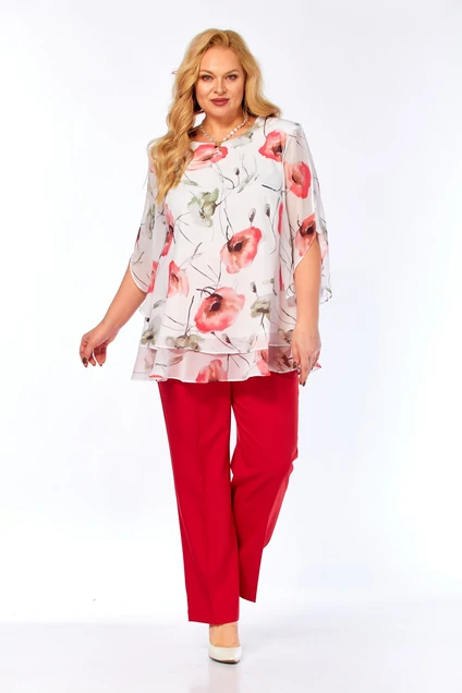 Костюм брючный 2213-13 Элль-стиль — отличное решение для летнего сезона. Коллекция бренда Элль-стиль сочетает в себе стильный дизайн и удобство. Двухпредметный комплект включает в себя воздушную блузу из принтованного шифона и слегка зауженные брюки. Блуза свободного кроя с втачными рукавами и округлым вырезом горловины создает легкий и элегантный образ. Брюки изготовлены из смешанной ткани с частично резиновым поясом для максимального комфорта. Яркий рисунок блузы подчеркивает уникальность стиля, а насыщенный красный цвет брюк добавляет выразительности. Идеально подходит для прогулок и встреч в теплое время года.