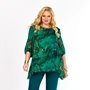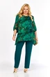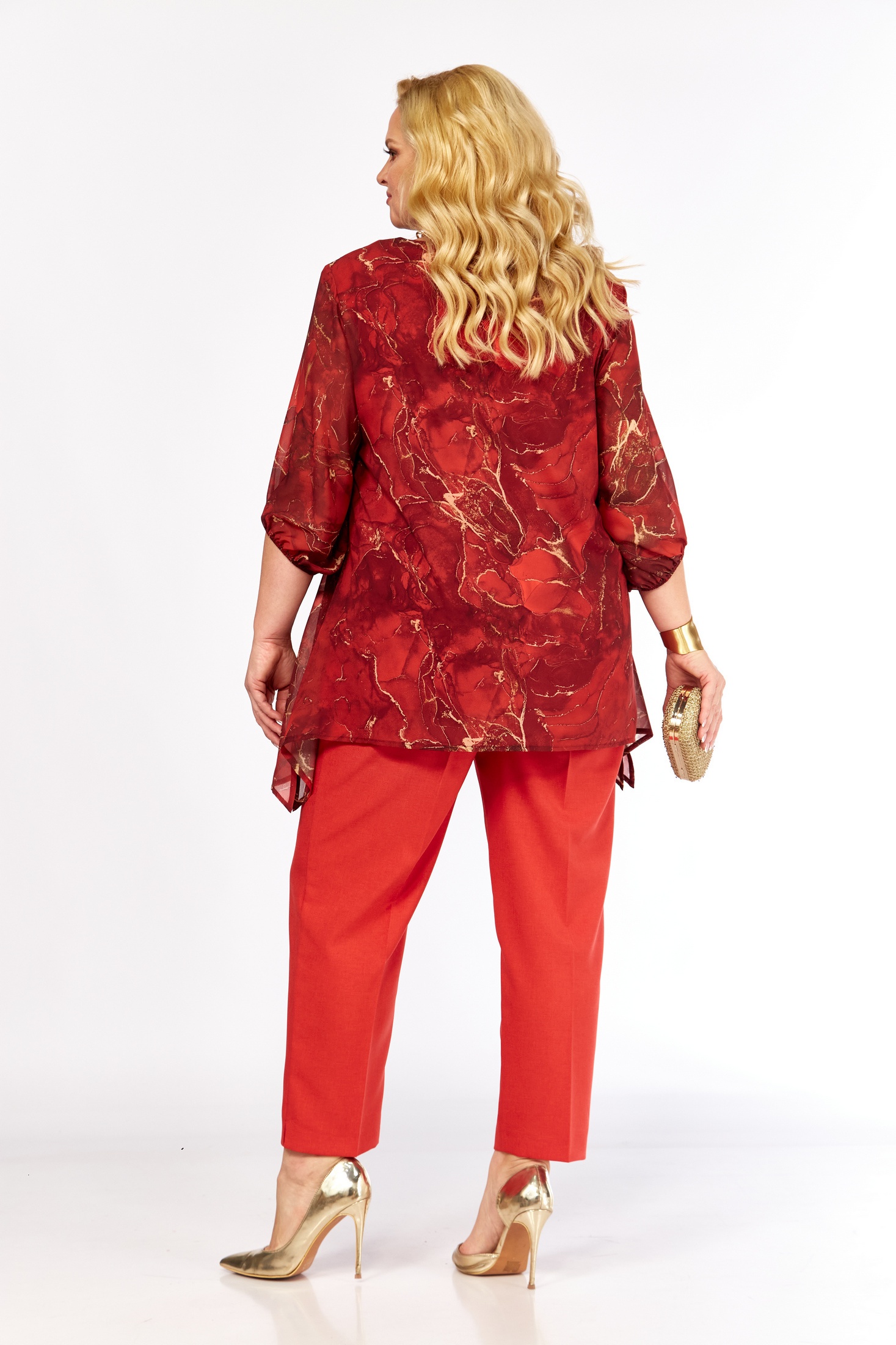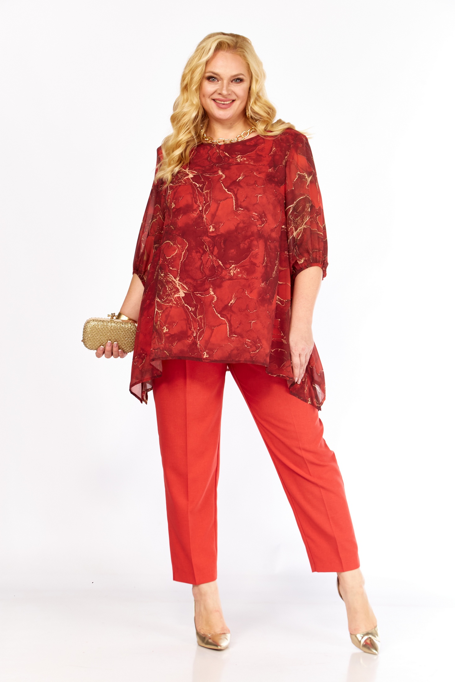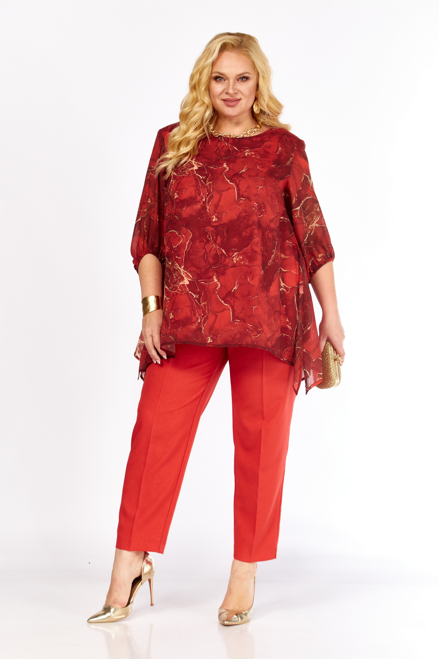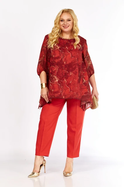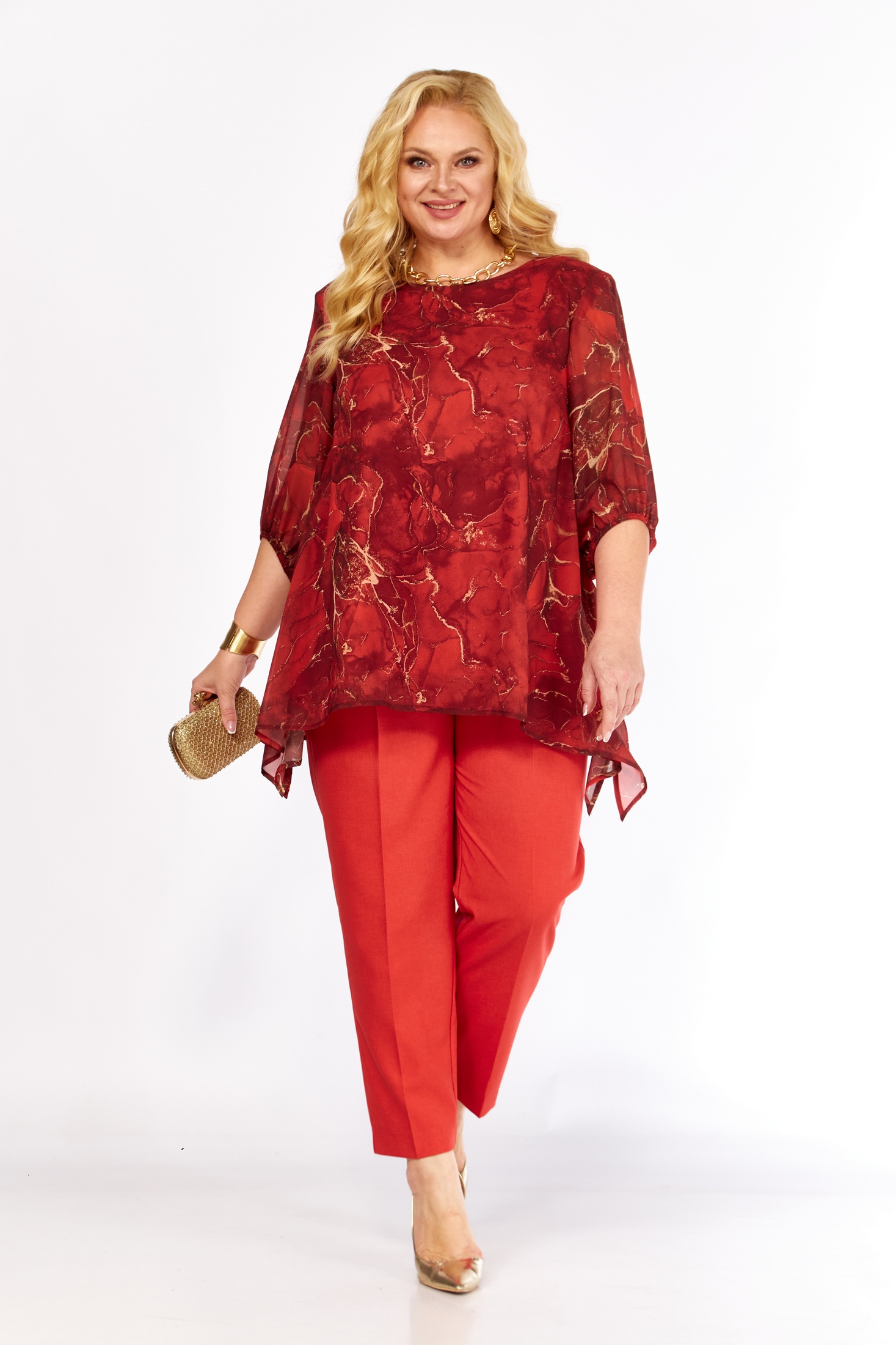 Брючный комплект предназначен для элегантных женщин. Блуза сводного кроя из принтованного шифона, что придает уникальность стилю своими красками. На полочке нагрудные вытачки, вырез горловины аккуратной округлой формы. Рукав втачной, свободный, низ присборен. Брюки слегка зауженные к низу. Пояс притачной, частично на резинке.