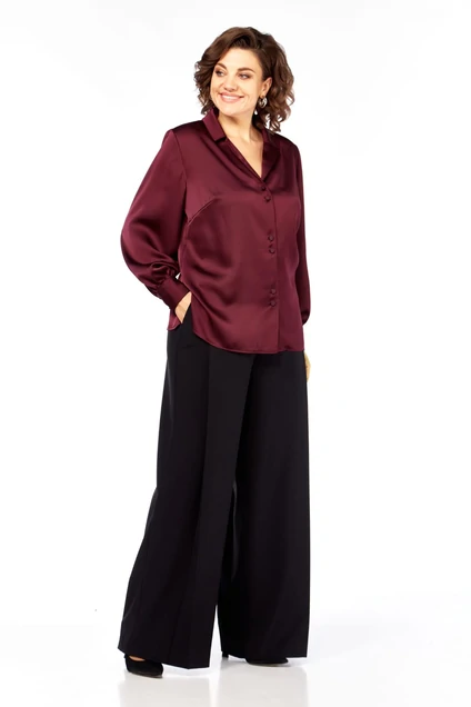 Комплект женский брючный 2-х предметный. Прекрасный вариант для визитов в офис, а так же в место, где уместен деловой стиль. Модель полуприлегающего силуэта с застежкой спереди на пуговицы. Воротник аккуратный отложной. Рукав втачной, по низу оформлен складками и притачной манжетой, застегивающейся на пуговицы. В боковых швах скругленные разрезы. Спинка с вертикальными выточками. Невероятно комфортные, элегантные брюки-палаццо, образ в котором будет привлекать к себе внимание окружающих. Идеально подходит как для офиса, так и для вечернего выхода. Брюки свободные. По переду заложены складки, в боковых швах расположены боковые карманы, застежка-молния. Пояс притачной, сзади на резинке, это обеспечивает комфортную посадку. Широкий крой палаццо добавляет образу легкость и непринужденность, стрелки визуально удлиняют силуэт.