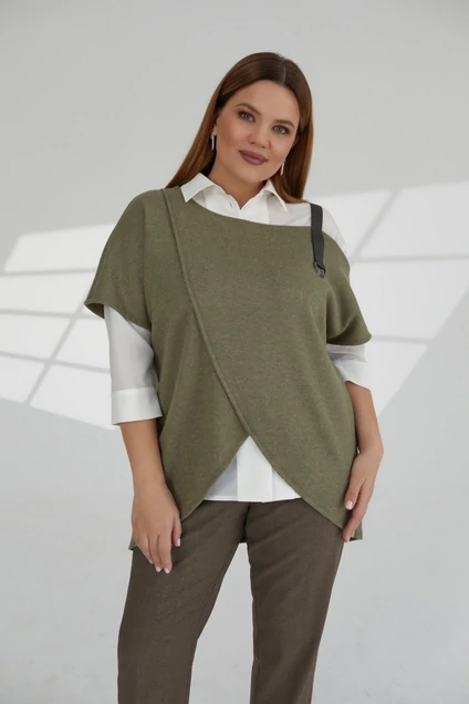 Интересный женский комплект тройка, состоящий из трикотажной жилетки, блузки и брюк.Брюки прямые, слегка заужены к низу, на поясе по бокам резинка, выполнены из высококачественной костюмно-плательной ткани с добавлением вискозы. Блузка с рукавом 3/4 и рубашечными воротником. Застегивается напуговицы по переду изделия. Дизайнерский жилет из мягкого качественного трикотажа, ассиметричного кроя. По левому плечу вырез соеденен лямкой. Блузка - вискоза 64%, полиэстер 34%, спандекс 2%; Брюки - вискоза 49%, полиэстер 29%, шерсть 20%, спандекс 2%