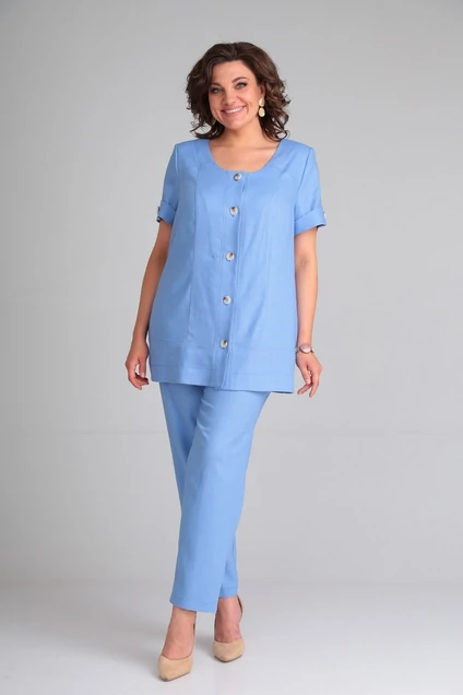 Костюм брючный двойка из текстильной ткани. Жакет прямого силуэта с застежкой-планкой на петли-пуговицы. Вырез горловины округлый. На полочке отстрочены фигурные кокетки, вертикальные рельефы. Отделочной строчкой выделен горизонтальный подрез по низу жакета . На спинке средний шов, вертикальные талиевые вытачки, горизонтальный подрез по низу жакета. В шов кокетки вставлена пата с пуговицей. Рукав втачной, с отложной манжетой . Длина жакета по спинке от плечевого шва у выреза горловины вниз 77см, длина рукава 23см. Брюки средней посадки на поясе со вставками эластичной тесьмы и с застежкой-гульфик на молнию и пуговицу. Длина брюк 106см.