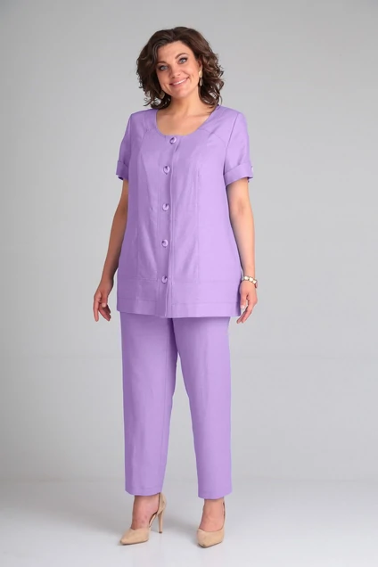 Костюм брючный двойка из текстильной ткани. Жакет прямого силуэта с застежкой-планкой на петли-пуговицы. Вырез горловины округлый. На полочке отстрочены фигурные кокетки, вертикальные рельефы. Отделочной строчкой выделен горизонтальный подрез по низу жакета . На спинке средний шов, вертикальные талиевые вытачки, горизонтальный подрез по низу жакета. В шов кокетки вставлена пата с пуговицей. Рукав втачной, с отложной манжетой . Длина жакета по спинке от плечевого шва у выреза горловины вниз 77см, длина рукава 23см. Брюки средней посадки на поясе со вставками эластичной тесьмы и с застежкой-гульфик на молнию и пуговицу. Длина брюк 106см.