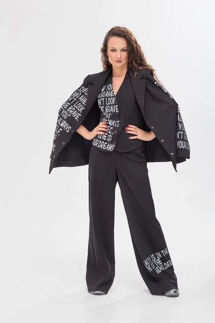 Комплект женский, выполнен из трикотажного полотна, состоящий из жакета, жилета и брюк. Жакет прямого силуэта. Застёжка на кнопки. Воротник пиджачного типа. Рукав втачной, двухшовный, длинный. Жилет полуприлегающего силуэта. Застёжка на кнопки. По переду имитация прорезного кармана с листочкой. Низ разноуроневый, фигурный. Брюки прямого силуэта, типа "палаццо". По переду карманы и имитация застёжки. Пояс притачной, с резинкой по боковым и задней частям. По низу брюк широкая подгибка, что позволяет регулировать длину. Комплект декорирован дизайнерским принтом.