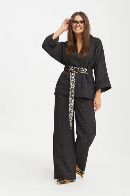 Костюм женский, состоящий из жакета в стиле "кимоно" и брюк. Комплект выполнен в ткани, имитирующей "стежку". Жакет прямого силуэта. По переду и спинке широкие шлёвки и съёмный пояс из декоративной тесьмы с пряжкой, что позволяет регулировать величину объемов. Горловина и край борта с притачной планкой. Рукав цельнокроеный, заканчивающийся притачной манжетой. Брюки прямого силуэта. По переду карманы. Пояс притачной, с застежкой на петли, пуговицы и молнию. По задней части пояса резинка.