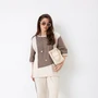 Комплект женский состоящий из блузы и брюк. Блуза :прямого силуэта с длинным втачным рукавом, со сборкой по окату и воланом на резинке по низу. Перед с центральной застежкой, навесными петлями и пуговицами. Вырез горловины Y-образный с воротником стойкой, переходящий в завязывающийся бант. Перед и спинка с фигурными кокетками, в швы кокеток вставлены двойные воланы разной ширины. Брюки прямого силуэты с притачным поясом на застежке молнии. По спинке по поясу резинка и талиевые вытачки. Перед с застежкой-гульфик и пуговицей, с накладными карманами с боковым входом. В комплект входит декоративный ремень.