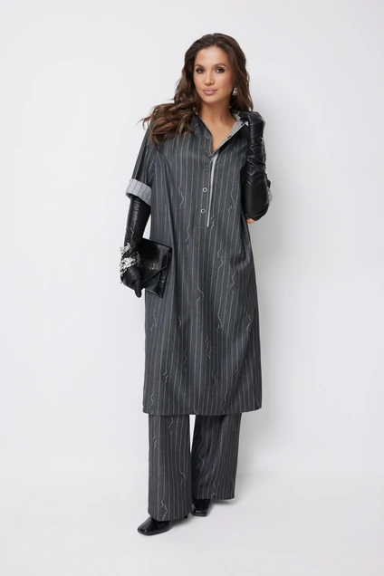 Комплект женский, состоящий из туники и брюк. Туника прямого силуэта, по переду планка-поло с застежкой на декоративные кнопки. Воротник рубашечного типа, рукав втачной длинной 3/4. В боковых швах высокие разрезы. Брюки прямого силуэта, передняя часть с боковыми карманами, задняя часть с вытачками. Застежка на молнию, петлю пуговицу, пояс притачной со шлевками и резинкой по боковой и задней частям. В комплекте используется двухлицевая ткань, что позволяет регулировать длину рукава.