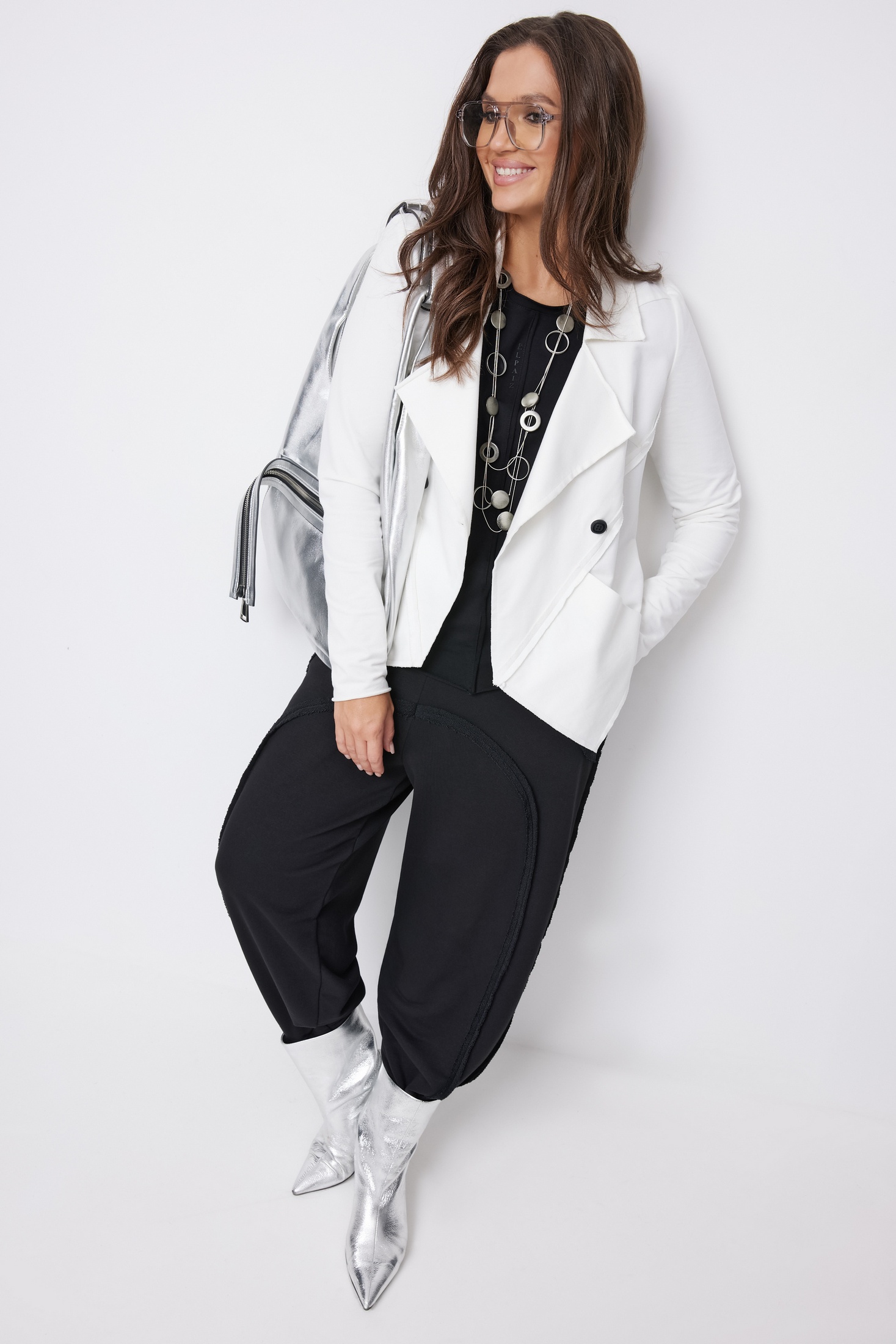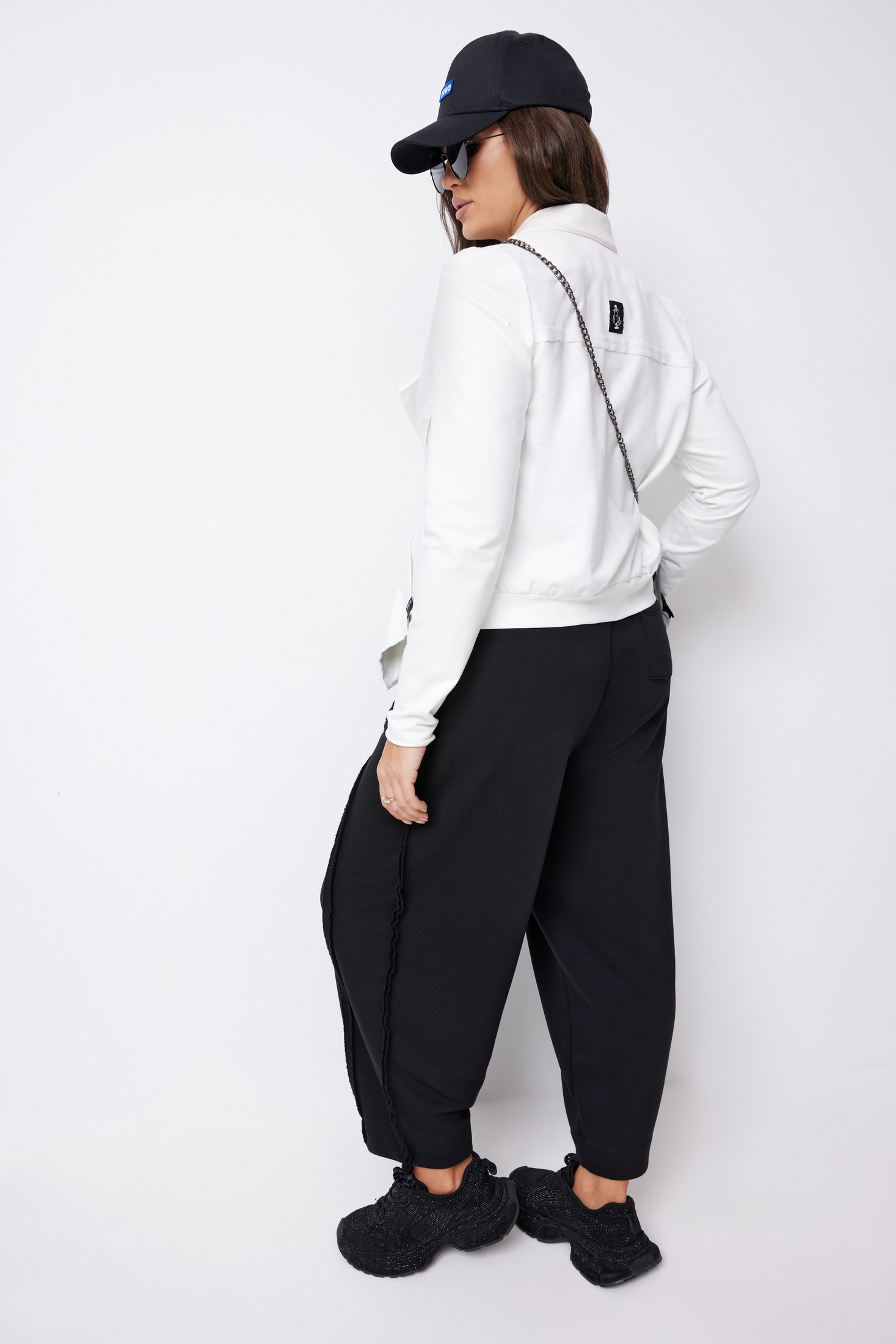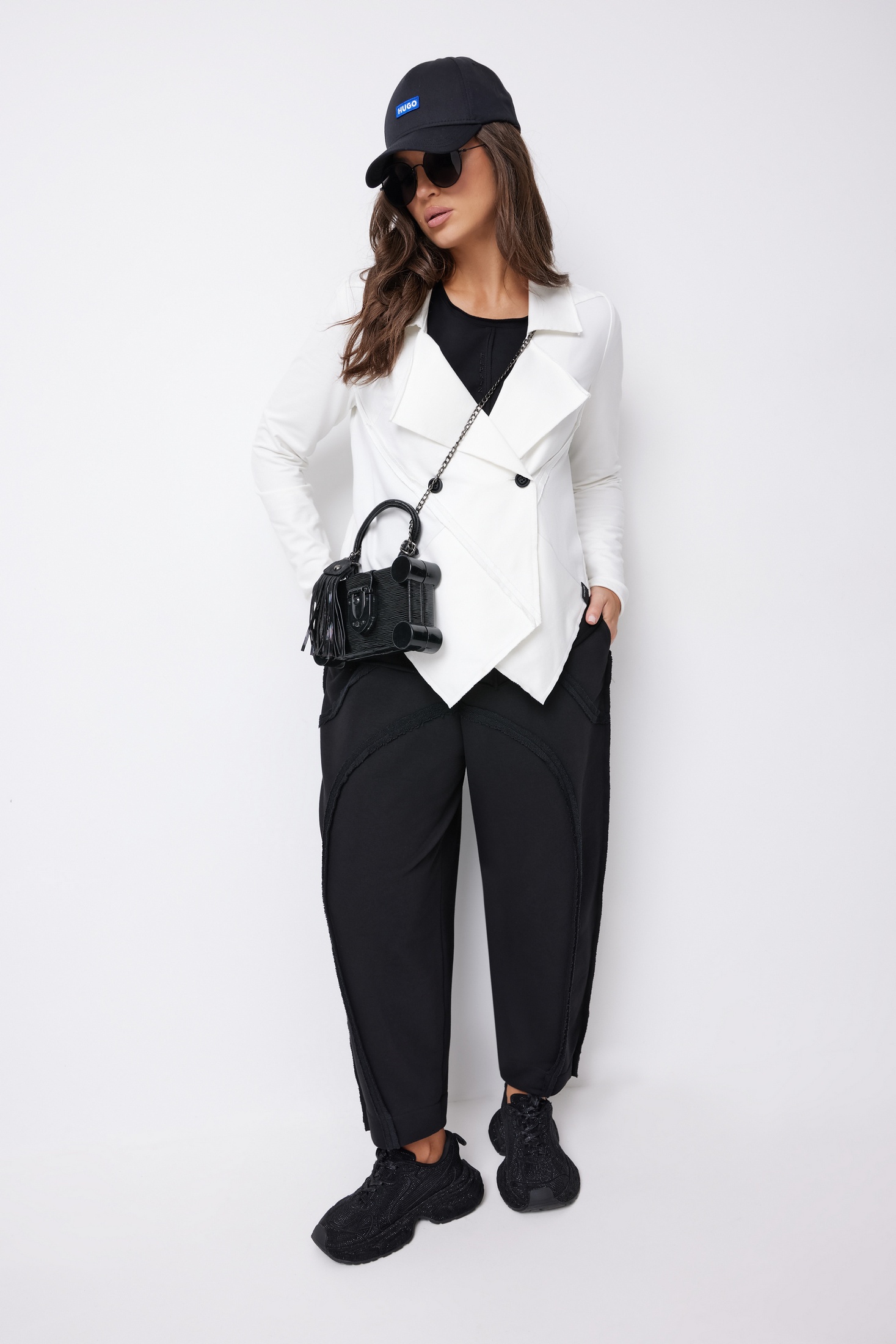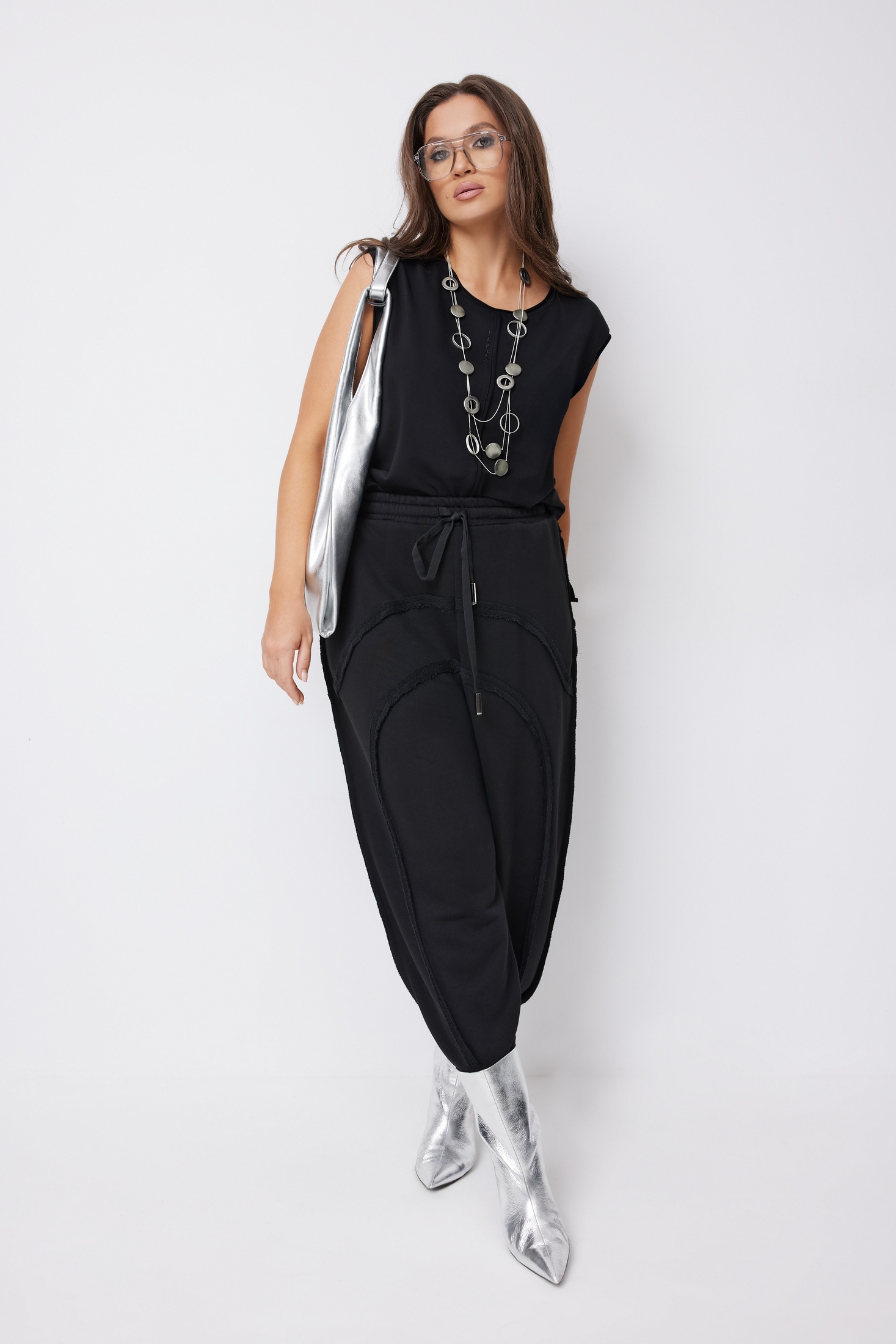 Комплект женский, состоящий из жакета топа и брюк. Жакет прямого силуэта. Застежка двубортная на петли-пуговицы. Воротник пиджачного типа. По переду кокетка, подрезы, накладные карманы. Спинка с кокеткой и притачной планкой по низу. Рукав втачной, длинный. Низ разноуровневый. В жакете использовались швы с открытыми срезами. По переду и спинке нашиты фирменные логотипы. Топ прямого силуэта со средними швами по переду и спинке с планками с открытыми срезами, по горловине и проймам планки с открытыми срезами, в боковых швах разрезы. По переду топа фирменный логотип. Брюки свободной формы (бананы) на притачном поясе с резинкой и декаротивным шнуром, брюки с заниженной линией сидения, в боковых швах карманы, на задней части брюк с левой стороны декоративный накладной карман, перед с фигурными авторскими рельефами, рельефы переда и боковые швы с открытым срезом.