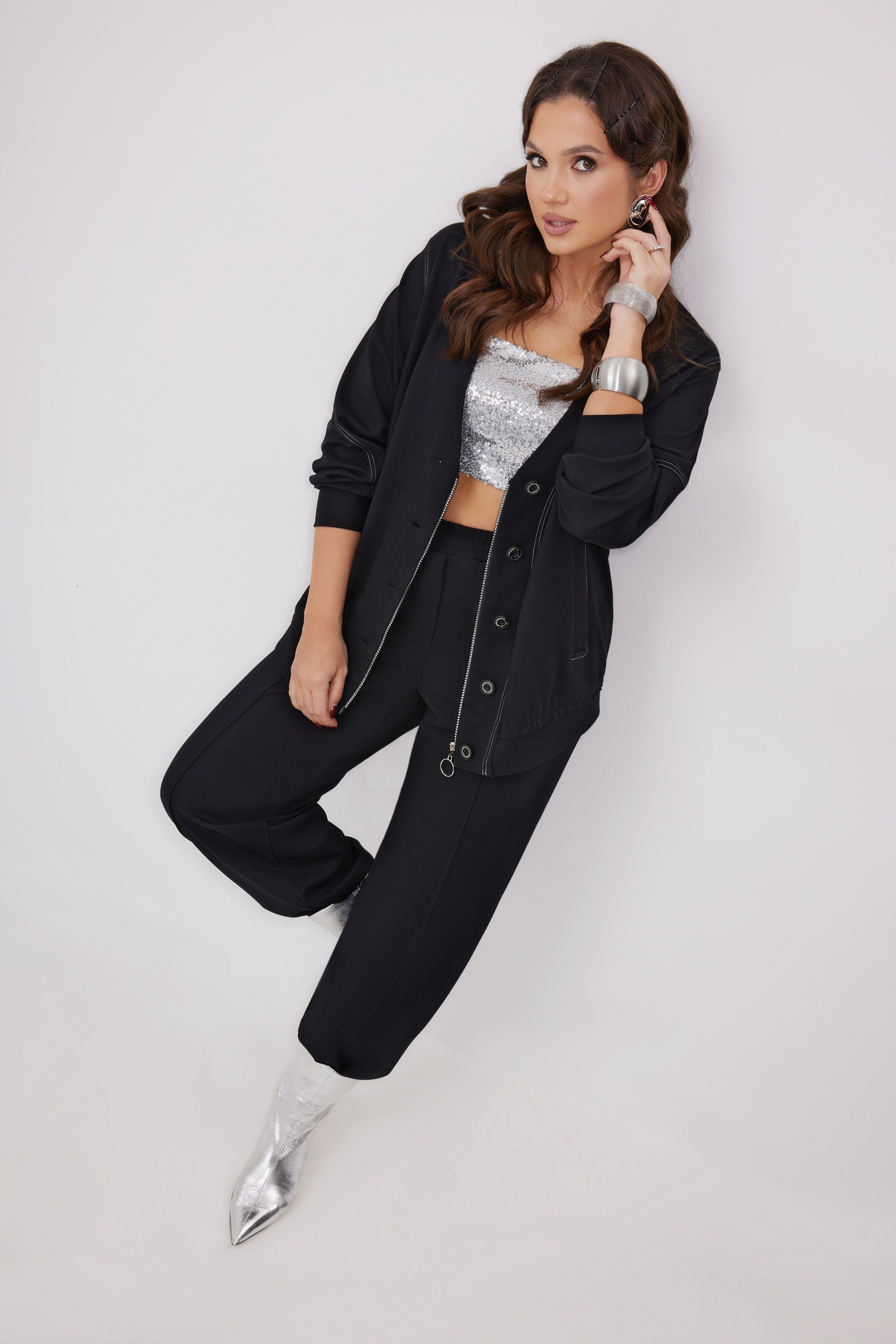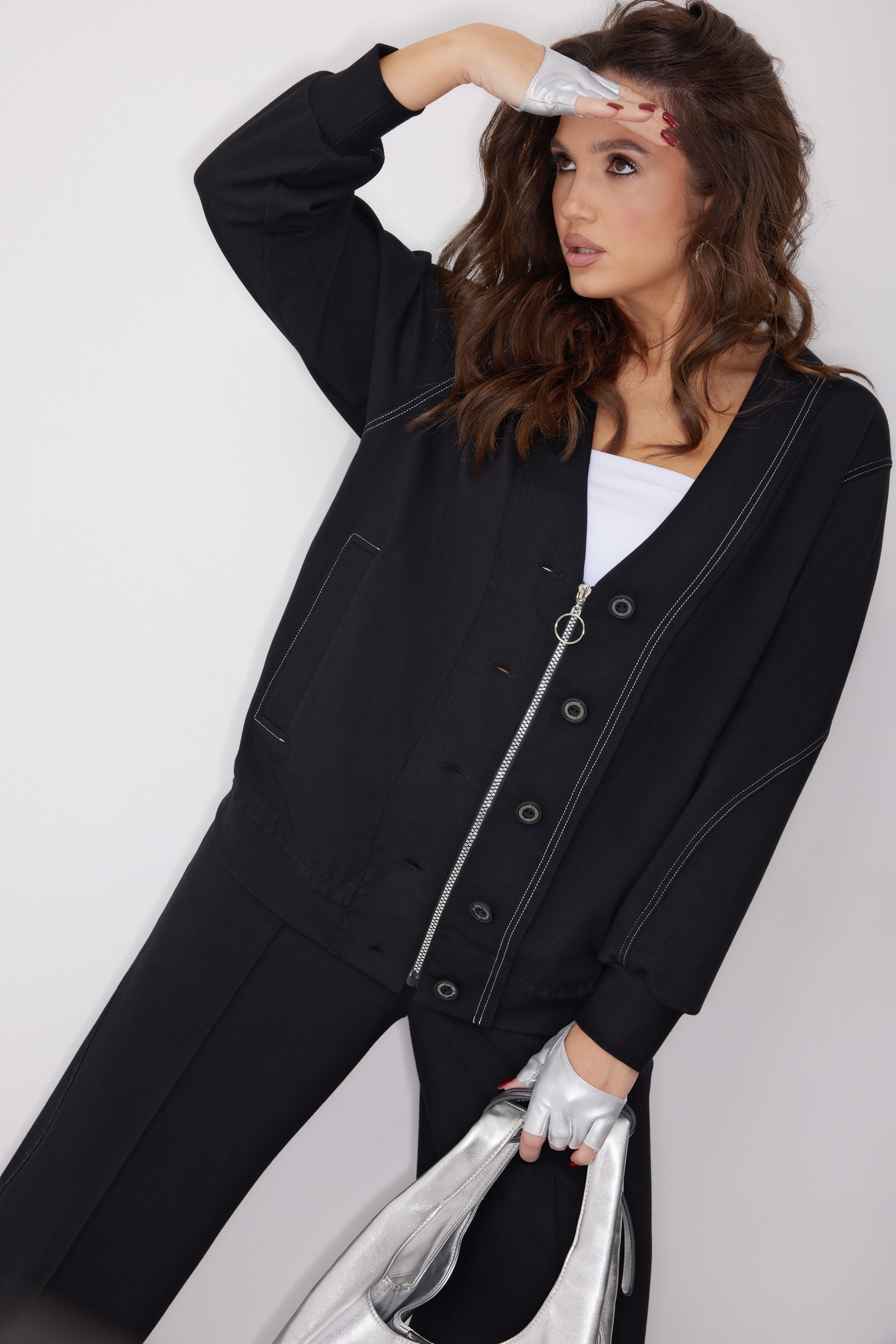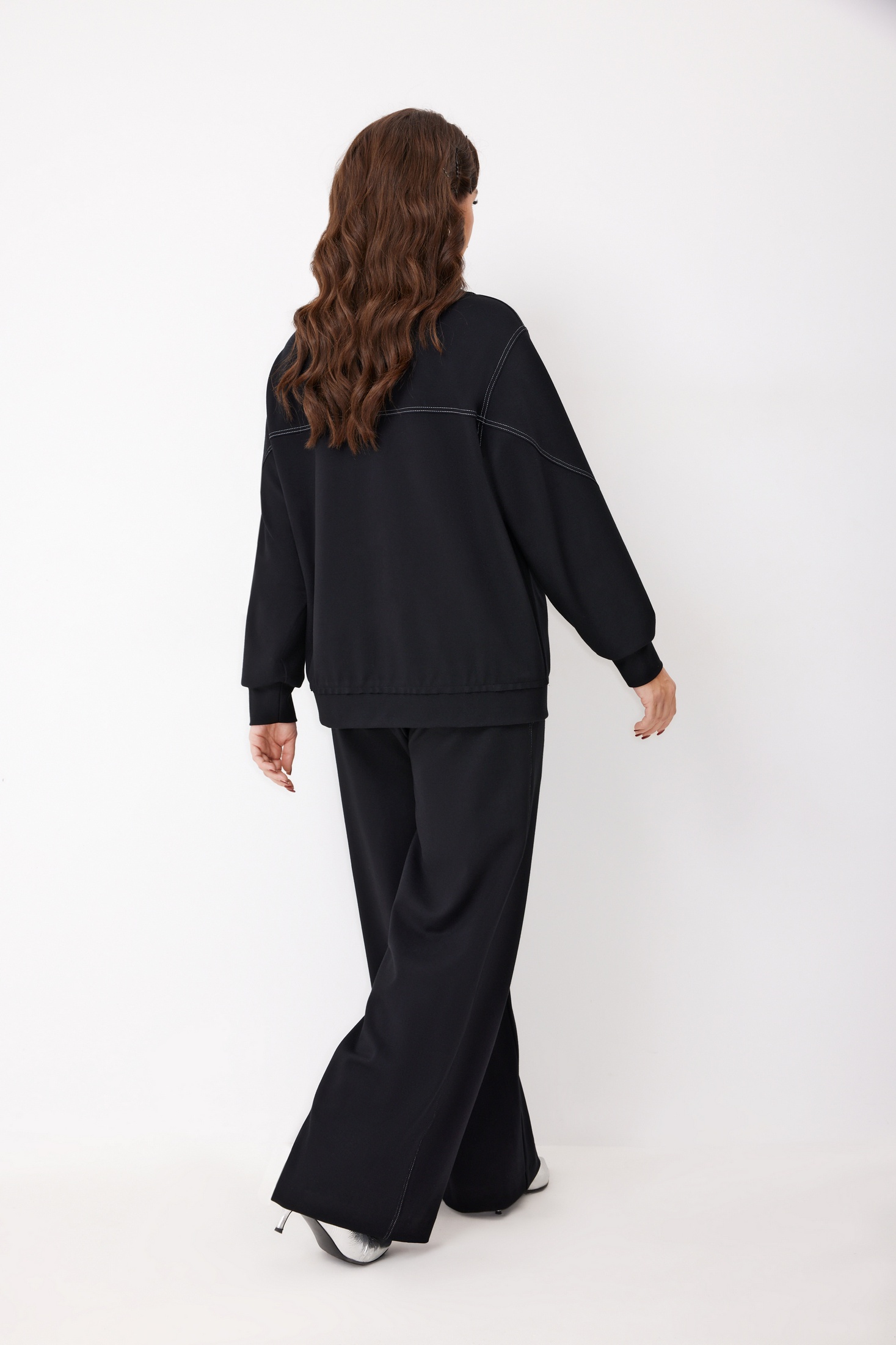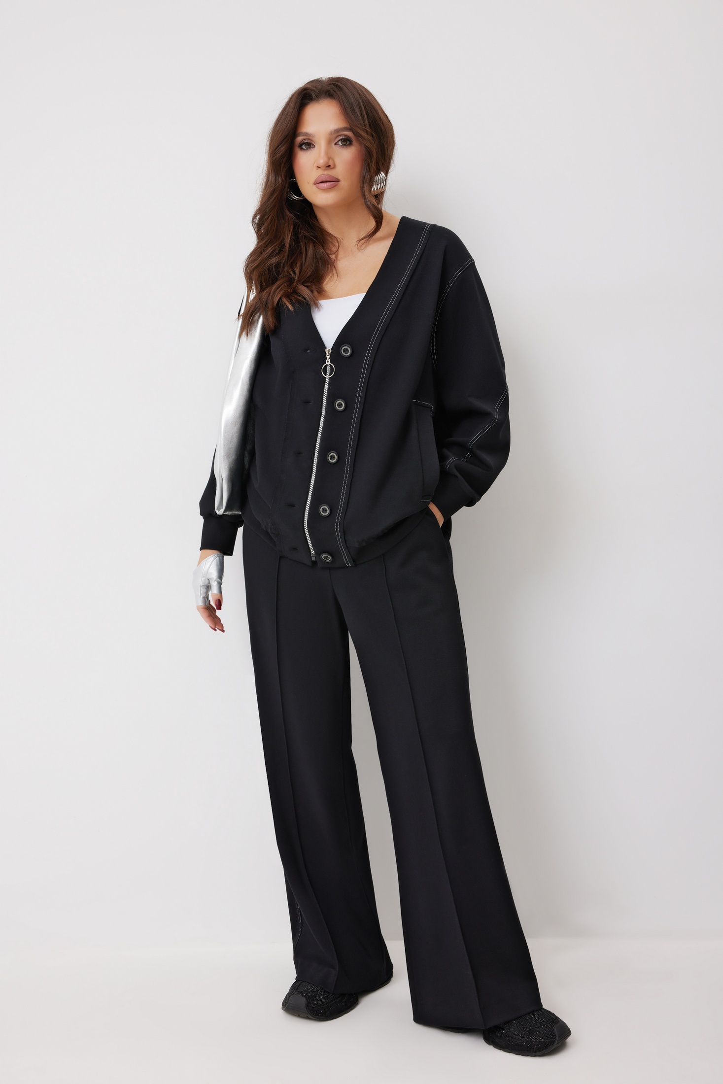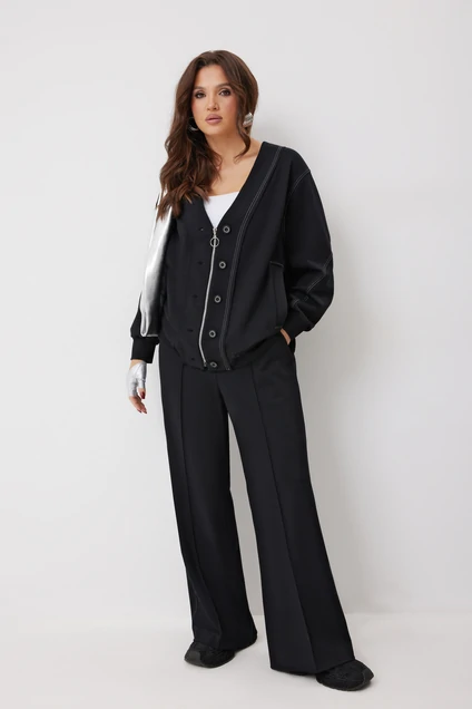 Комплект женский, состоящий из кардигана и брюк. Кардиган прямого силуэта, со спущенной линией плеча. Рукав длинный, заканчивающийся притачной манжетой. Спинка с горизонтальной кокеткой. Вырез горловины V-образный. По краю борта, горловине, спинке и низу кардигана притачные планки. Кардиган застегивается на притачную молнию либо на петли-пуговицы. Брюки прямого силуэта, по переду карманы и имитация застёжки. Пояс притачной с резинкой. Комплект декорирован отделочными строчками, нитками контрастного цвета и частично открытыми срезами.