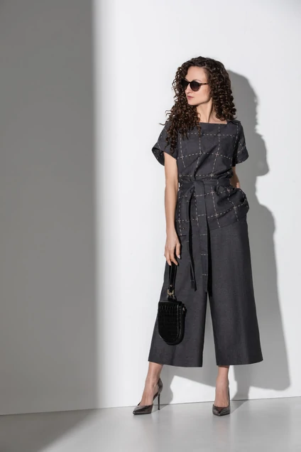 Костюм женский, состоящий из кюлот и блузки. Блузка прямого силуэта, со спущенной линией плеча и манжетой. Воротник отложной, горловина формы "каре". В боковых швах разрезы. Кюлоты прямого силуэта. Передняя часть с карманами и застежкой на молнию, петлю и пуговицу. Пояс притачной, со шлевками и резинкой по задней части. В комплекте пояс из основной ткани блузы.