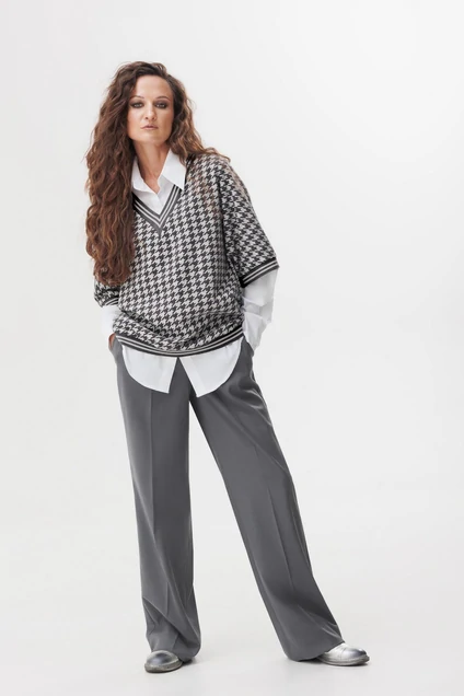 Комплект женский, состоящий из жилета, блузы и брюк. Жилет прямого силуэта, со спущенной линией плеча и V- образным вырезом горловины, выполнен из трикотажного полотна с довязами. Довязы по горловине - декоративный элемент, который по цвету может отличаться от цвета на фото. Блуза прямого силуэта ovwesize, со спущенной линией плеча. Застёжка на петли и пуговицы на планке. Рукав втачной, длинный со складками и манжетой с застёжкой на петли и пуговицы. Спинка с кокеткой и складкой. Воротник рубашечного типа. Низ разноуровневый фигурный. Брюки прямого силуэта, по передней части карманы. Застёжка на молнию, петлю и пуговицу. Пояс притачной со шлёвками и резинкой по задней части. По низу брюк широкая подгибка, что позволяет регулировать длину.