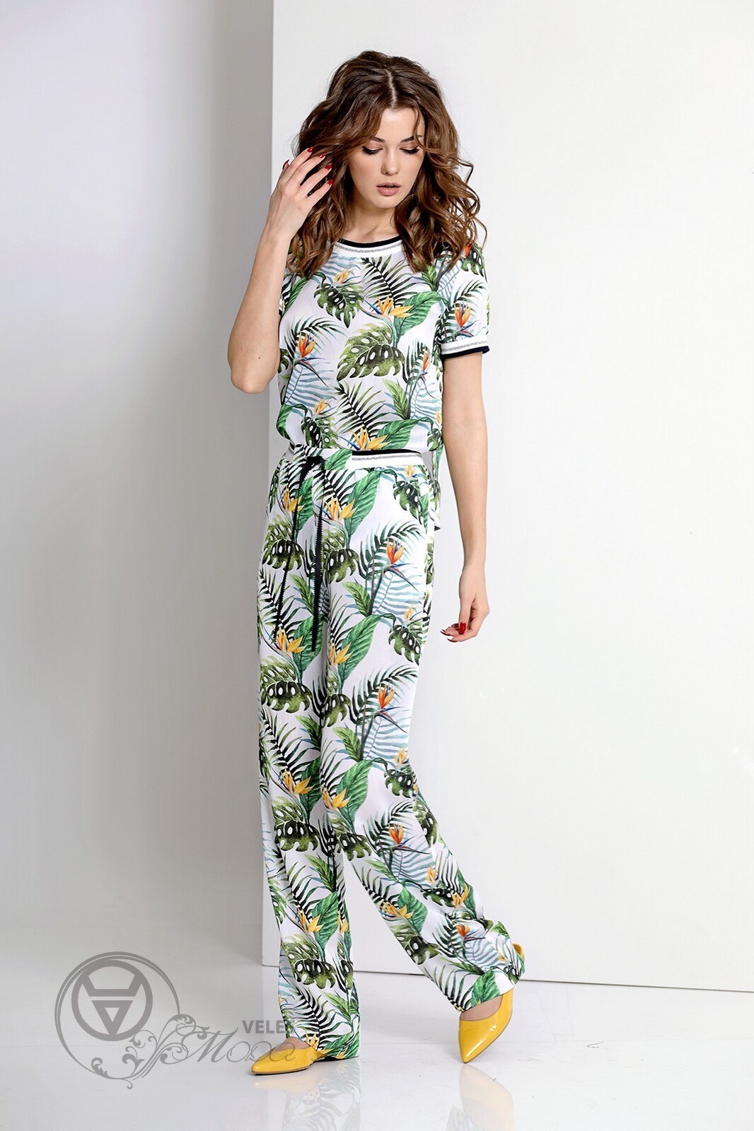 Комплект состоит из блузки и брюк, выполнен из легкой плательной ткани с рисунком. Блузка с коротким рукавом имеет по бокам разрезы. Вырез горловины, низ рукава и пояс брюк выполнены из трикотажного подвяза. Брюки слегка заужены к низу с карманами в боковых швах. В качестве отделки на поясе спереди - завязывающийся шнур.