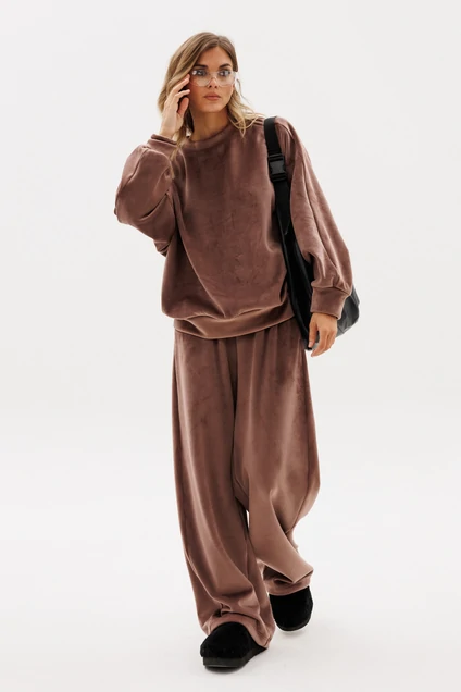 Комплект: джемпер+брюки. Комплект выполнен из двустороннего велюра в мелкий рубчик. Джемпер О-образного силуэта, покроя "oversize", длиной до линии бедер. Перед и спинка цельные. Горловина округлой формы, обработана бейкой. Плечевой шов удлинен. Рукав рубашечного покроя, одношовный. Низ рукава на манжете. Верхняя часть рукава переходит в кокетку переда т спинки и доходит до горловины. По низу джемпера обработан пояс. Пояс, манжеты, верхняя часть рукава и бейка горловины выполнены из основной, но без рубчика. Брюки на притачном поясе с эластичной тесьмой, прямого силуэта, длиной в пол, покроя "oversize". Боковой шов заменен лампасом. В швах лампаса карманы. Сзади накладные карманы. В пояс протянут шнур с наконечниками. По низу брюк втянута эластичная тесьма с фиксаторами. Лампасы и пояс выполнены из основной ткани, но без рубчика.
