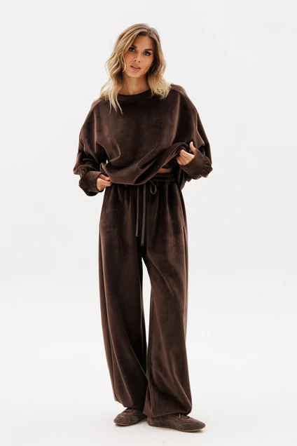 Комплект: джемпер+брюки. Комплект выполнен из двустороннего велюра в мелкий рубчик. Джемпер О-образного силуэта, покроя "oversize", длиной до линии бедер. Перед и спинка цельные. Горловина округлой формы, обработана бейкой. Плечевой шов удлинен. Рукав рубашечного покроя, одношовный. Низ рукава на манжете. Верхняя часть рукава переходит в кокетку переда т спинки и доходит до горловины. По низу джемпера обработан пояс. Пояс, манжеты, верхняя часть рукава и бейка горловины выполнены из основной, но без рубчика. Брюки на притачном поясе с эластичной тесьмой, прямого силуэта, длиной в пол, покроя "oversize". Боковой шов заменен лампасом. В швах лампаса карманы. Сзади накладные карманы. В пояс протянут шнур с наконечниками. По низу брюк втянута эластичная тесьма с фиксаторами. Лампасы и пояс выполнены из основной ткани, но без рубчика.