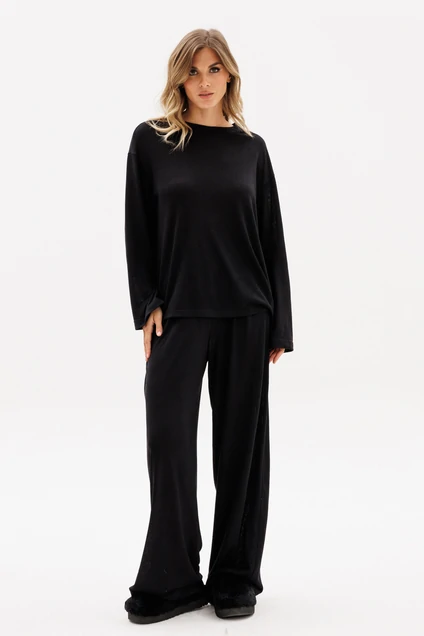 Комплект: джемпер + брюки. Комплект выполнен из трикотажного полотна. Джемпер прямого силуэта, длиной до линии бедра. Перед и спинка цельные. Горловина округлой формы, обработана широкой бейкой. Плечевой шов удлинен. Рукав рубашечного покроя, одношовный. Брюки прямого покроя, длиной в пол, на притачном поясе с эластиной тесьмой.