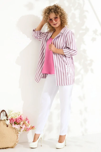 Костюм женский 3ка состоит из брюк топа и жакета. Жакет прямого кроя, по полочке жакета расположены накладные карманы с ассиметричным принтом. Рукав втачной. Вороник отложной с лацканами. Застежка петля-пуговица. Брюки на притачном поясе с резинкой, в боковых швах имеются карманы. Брюки зауженные к низу. Топ выполнен из атласной ткани с приглушенным блеском. Топ на узкой лямке.
