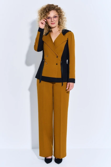 Костюм женский 2х предметный. Жакет полуприлегающего кроя, 2х бортный, Головина обработана воротником из трикотажного полотна. Рукав втачной длинный, низ рукава -манжета. На линии талии жакета находиться -кулиса. Застежка- кнопки. Брюки прямого кроя с завышенной талией, в боковых швах имеются карманы. Пояс притачной с резинкой, застежка- молния на гульфике