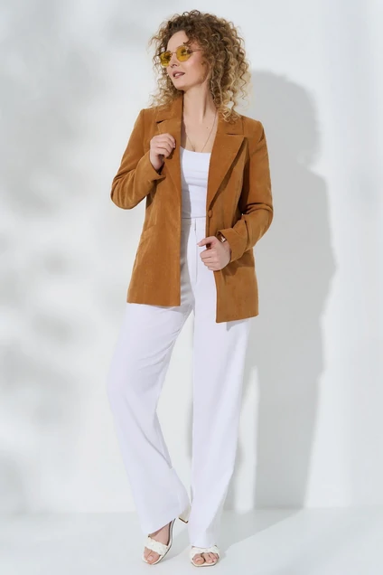 Костюм женский состоит из жакета и брюк. Жакет полуприлегающего силуэта выполнен из мягкой штруксовой ткани. По полочке изделия расположены прорезные карманы с листочками. Горловина -отложной воротник с лацканами. Рукав втачной длинный. По спинке жакета расположен центральный шов и таллиевые выточки. Жакет с подкладкой. Брюки прямого кроя, на притачном поясе с резинкой, завышенной посадки, застежка- молния на гульфике. Подкладка: ПЭ-100% Брюки: Пэ-55%, вискоза -30%, лен-15%