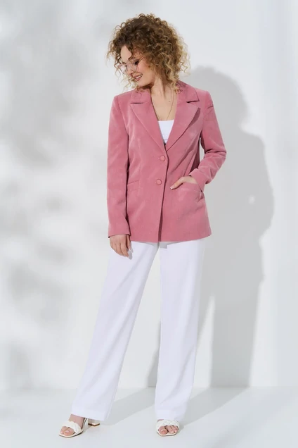 Костюм женский состоит из жакета и брюк. Жакет полуприлегающего силуэта выполнен из мягкой штруксовой ткани. По полочке изделия расположены прорезные карманы с листочками. Горловина -отложной воротник с лацканами. Рукав втачной длинный. По спинке жакета расположен центральный шов и таллиевые выточки. Жакет с подкладкой. Брюки прямого кроя, на притачном поясе с резинкой, завышенной посадки, застежка- молния на гульфике. Подкладка: ПЭ-100% Брюки: Пэ-55%, вискоза -30%, лен-15%