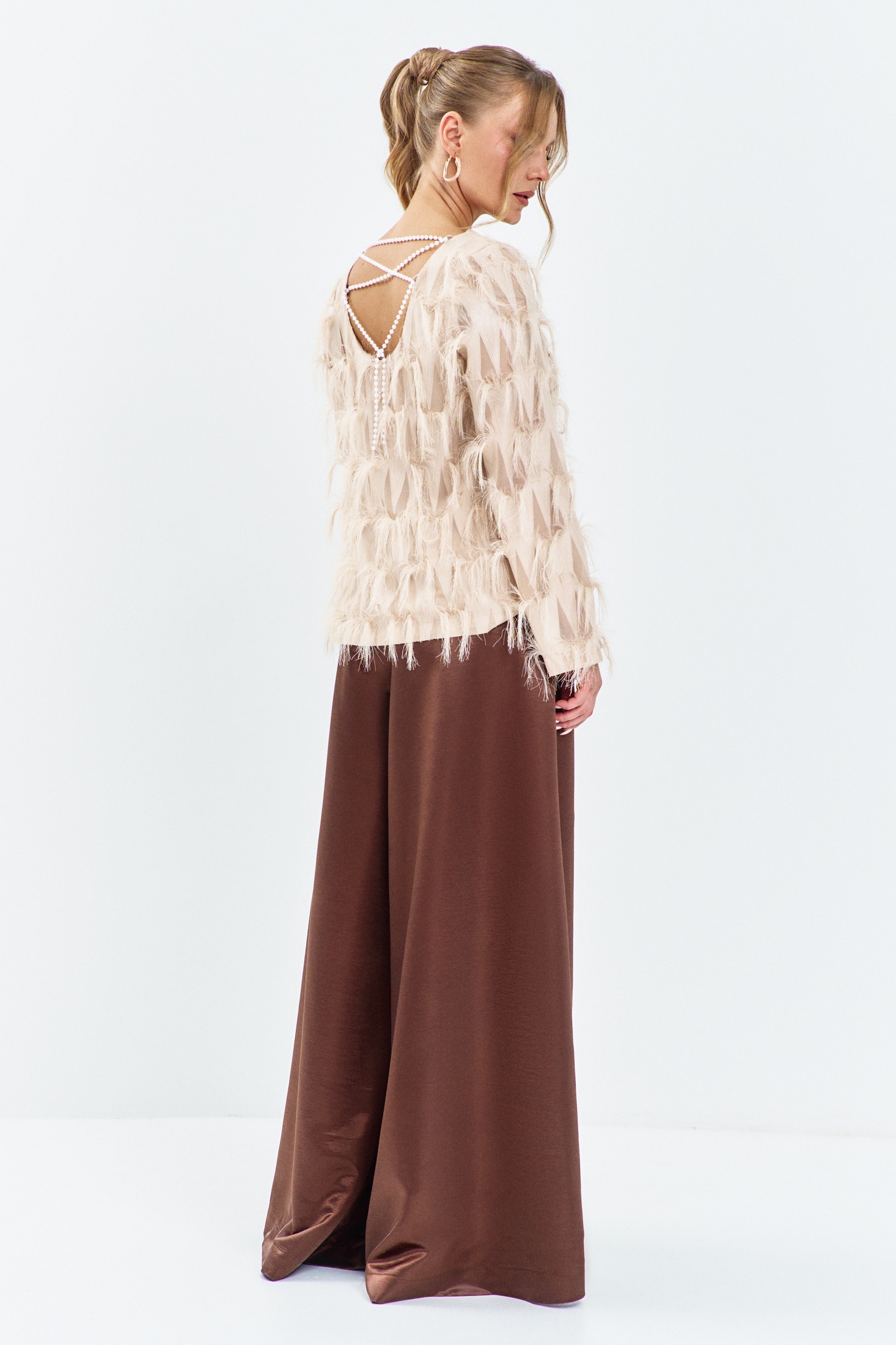 Комплект брючный состоит из джемпера и брюк. Брюки средней посадки расширенные к низу ( клеш от бедра , Юбка- брюки )выполнены из атласной ткани с приглушенным блеском. Брюки на притачном поясе с резинкой и застежкой молнией. Блузон выполнен из ткани с бахромой, горловина округлая - - лодочка, рукав втачной длинный, на спинке глубокий округлый вырез и декоративная жемчужная нить.