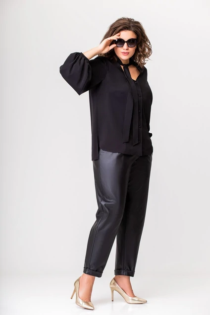 Этот комплект - отличный вариант для повседневных луков, который можно также смело комбинировать с другими вещами. Комплект женский двухпредметный, состоящий из блузы и брюк. Блуза свободного силуэта, выполнена из плательного крепа. Вырез горловины v-образный с воротником "стойка", переходящим в бант. Застёжка центральная на петли и пуговицы, рукав втачной, по низу собран на резинку. Декором служит дизайн ткани. Брюки выполнены из искусственной кожи на хлопковой основе. Пояс на брюках с частичной резинкой, на центральной застежке, по переду складки, в боковом шве обработаны карманы.