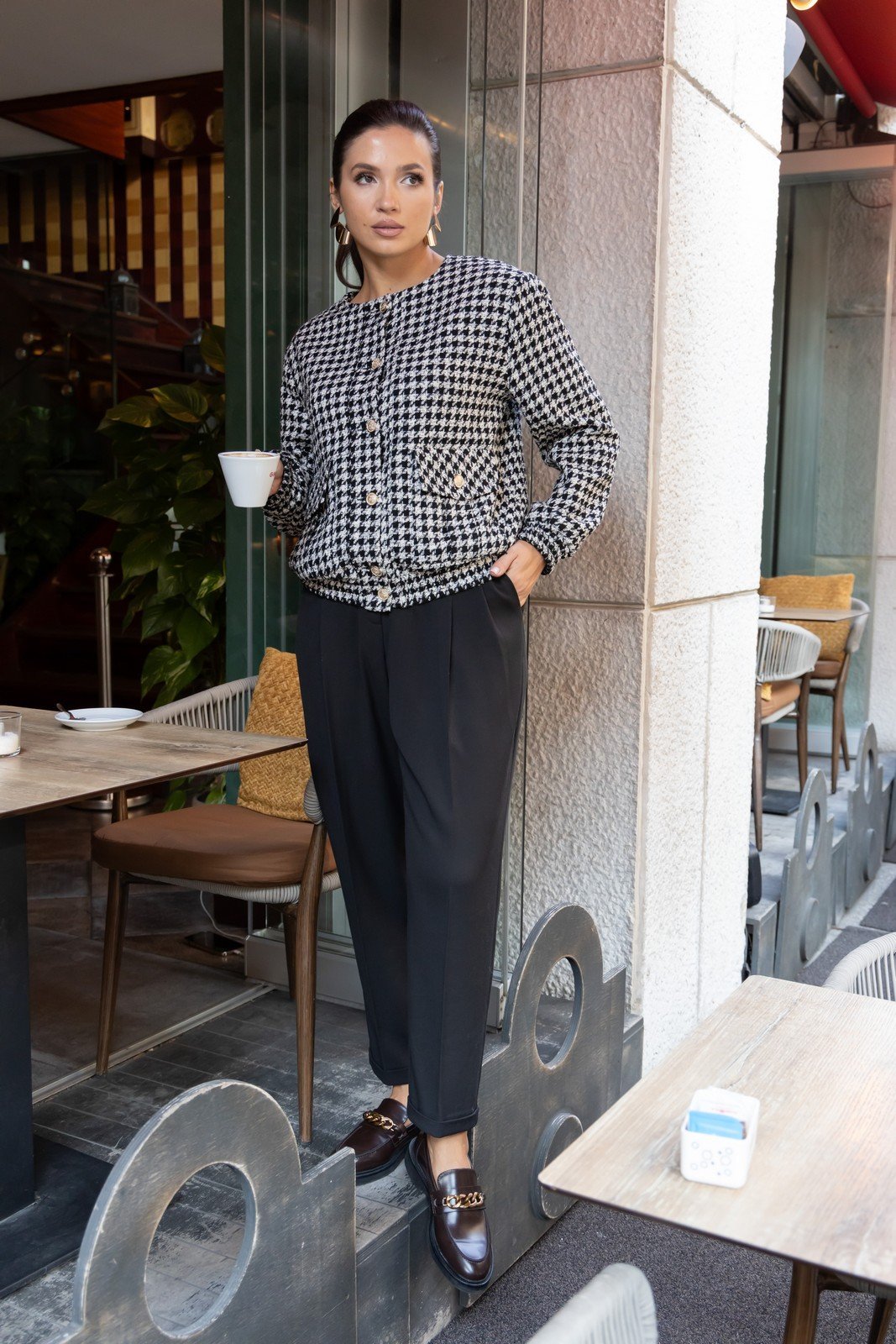 Костюм из приталенного жакета черно-молочной гусь-лапки и брюками-бананами (слоучи) может стать идеальной базой для офисного образа. подкладка:поливискоза жаккард (55% ПЭ 45% вискоза)