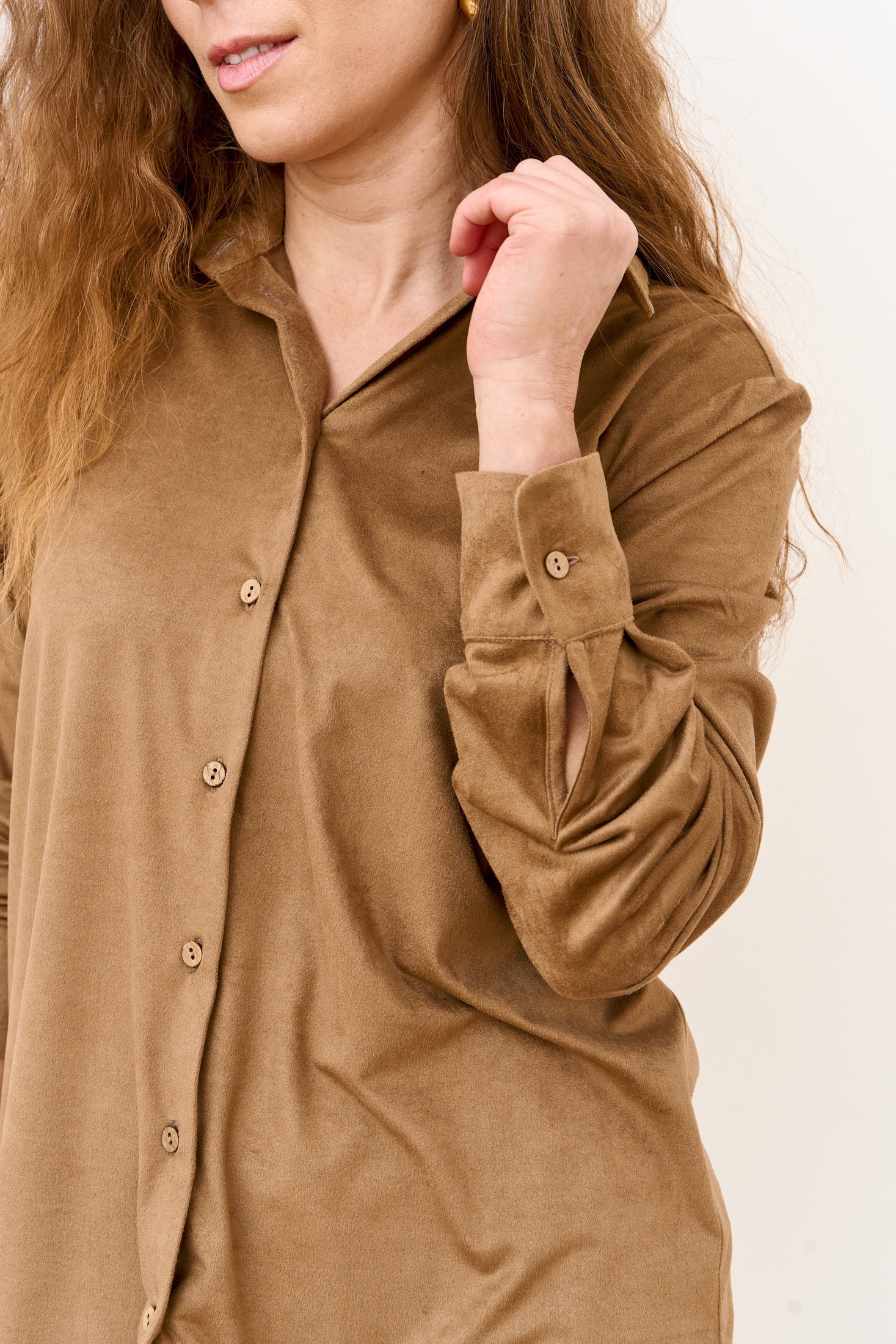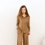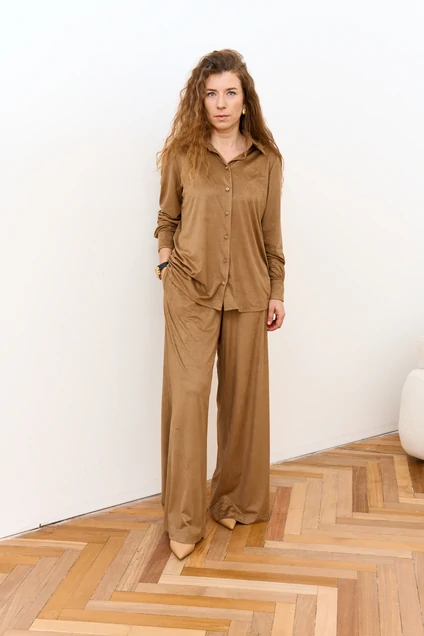 Костюм брючный 24126 FAMA — это воплощение комфорта и стиля. Коллекция бренда FAMA предлагает костюм из экозамши свободного кроя, идеально подходящий для повседневного и офисного гардероба. Брюки широкие, свободные, с посадкой на талии, дополнены притачным поясом на резинке и карманами в боковых швах. Длина брюк составляет 110 см, а низ обработан в подгибку с потайным швом. Блузка классического кроя, прямого силуэта, длиной 65 см ниже линии бедер, с застежкой на пуговицах, станет отличным дополнением к образу. Теплый оттенок делает костюм модным выбором на осень. Материал с добавлением вискозы обеспечивает мягкость и эластичность, а спандекс придаёт комфорт при движении.