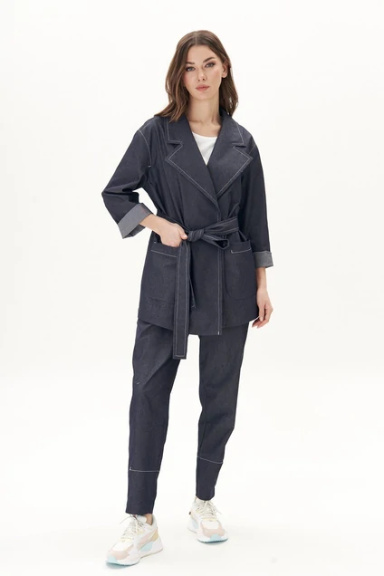 Свободный оверсайз-блейзер рубашечного покроя с заниженной линией плеча, пиджачным воротником с расширенным лацканом, рукавом, расширенным в области оката, без фиксирующей застёжки, со съёмным поясом. Полочки с накладным фигурным карманом с вытачкой и отделочной строчкой. Спинка с центральным швом. По линии борта, воротнику, шву втачивания рукава, поясу - контрастная строчка.