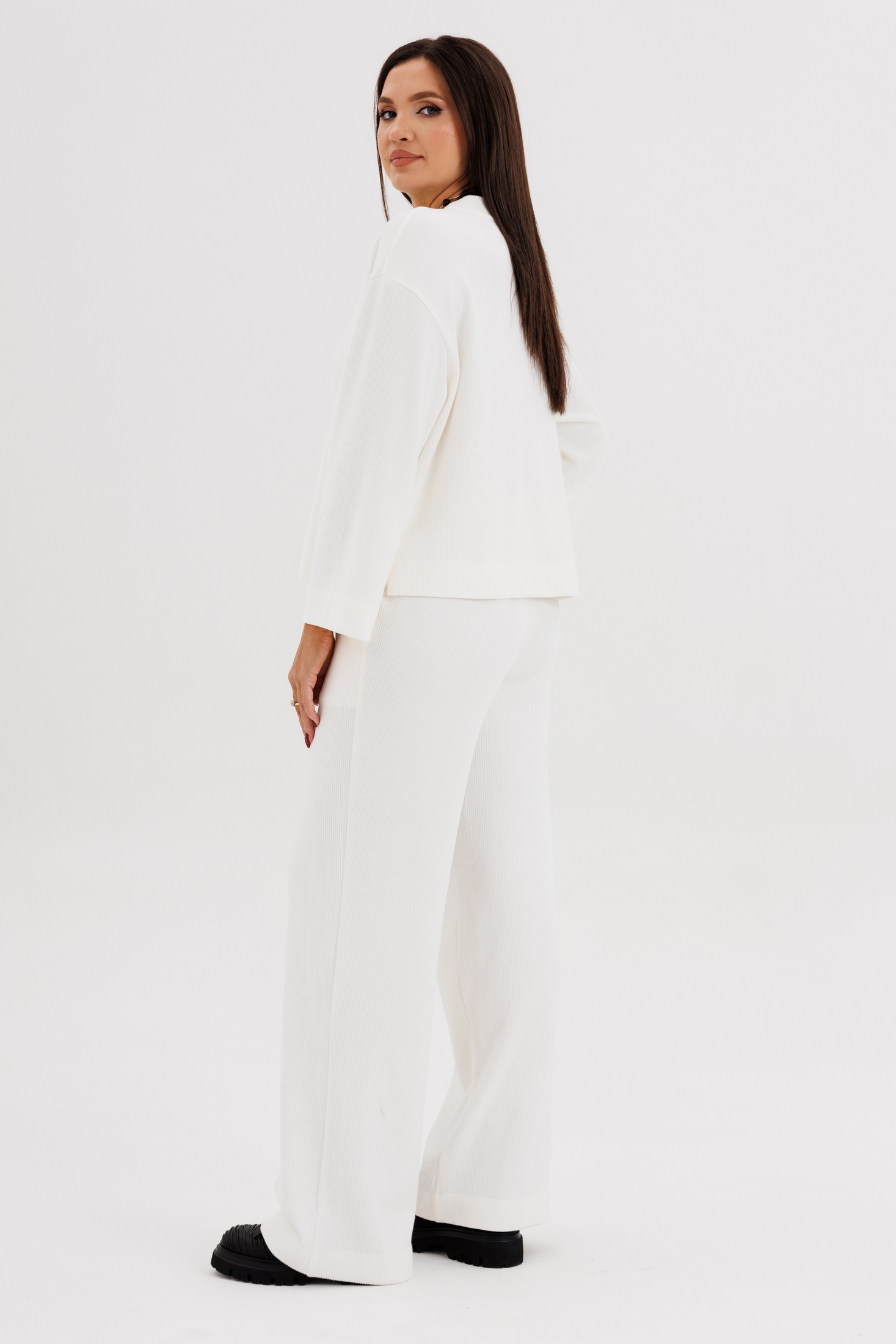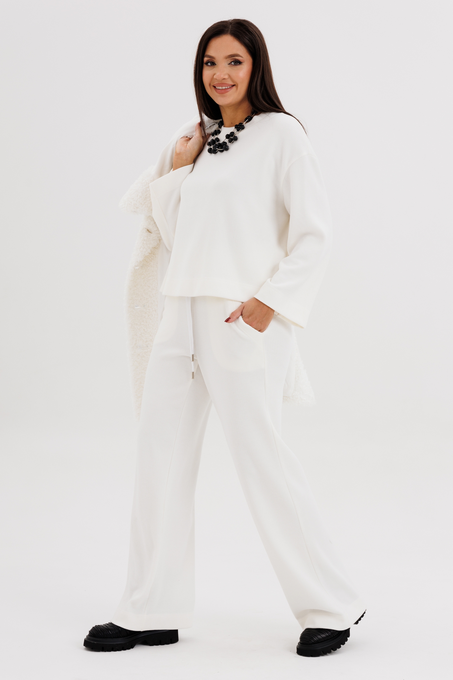 Такой вариант неформального костюма можно отметить отдельно-это настоящий шик, который в любой обстановке смотрится по-особенному. Невероятное ощущение расслабленности и комфорта обеспечивает удобный покрой и тактильно уютный трикотаж с эффектом вельвета. Брюки свободного кроя, прямые, с наклонными боковыми карманами , на эластичном поясе с люверсами и отделочным шнуром. Джемпер рубашечного покроя, свободный, слегка укороченный. Горловина круглая с притачной обтачкой. Рукав рубашечный расширенный к низу.