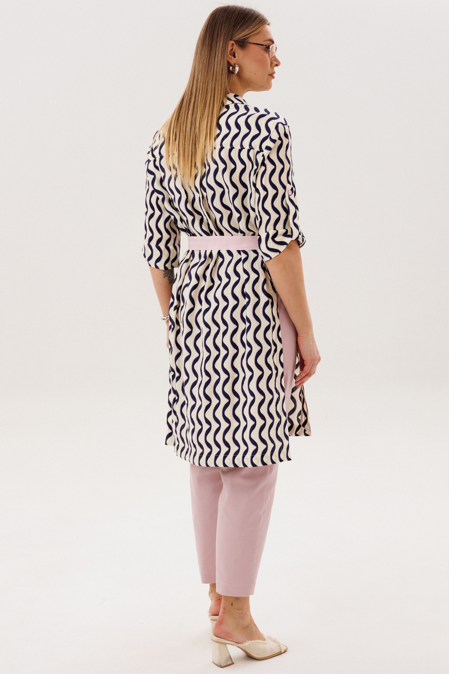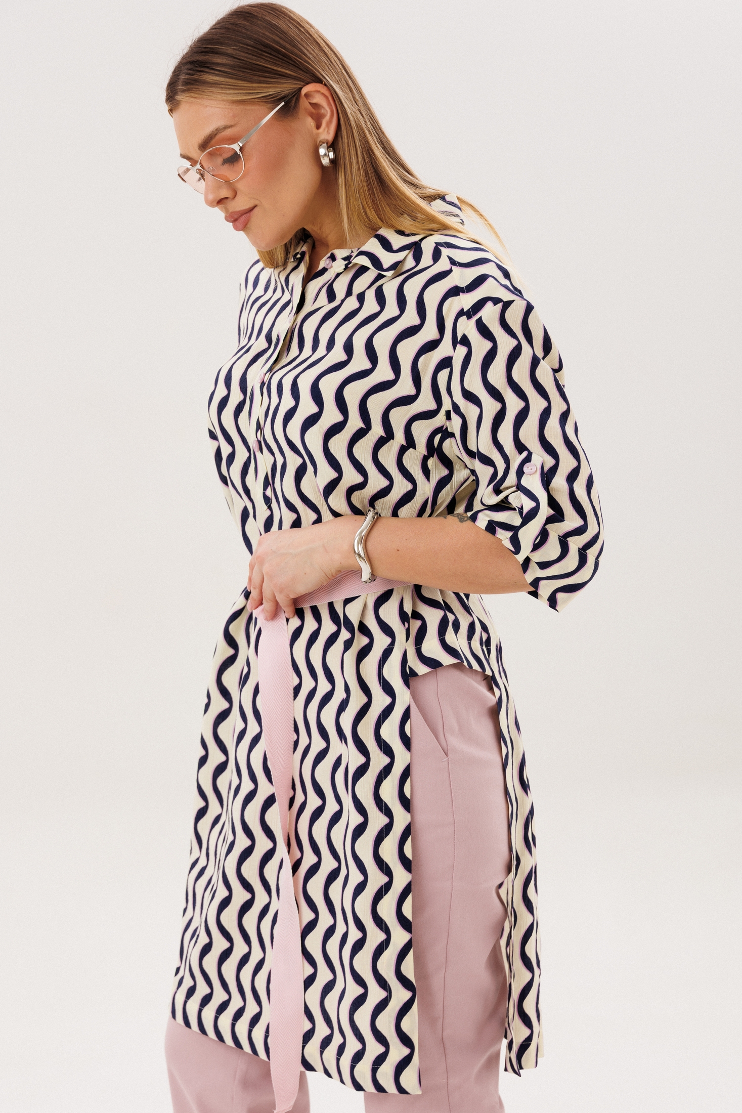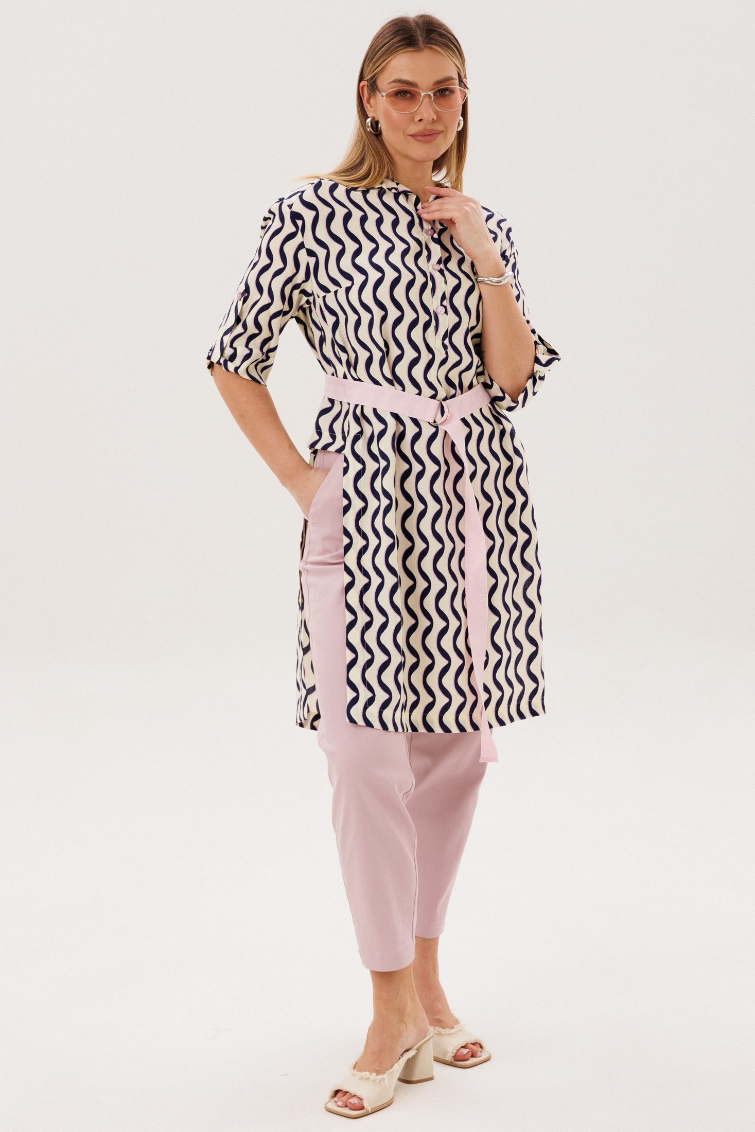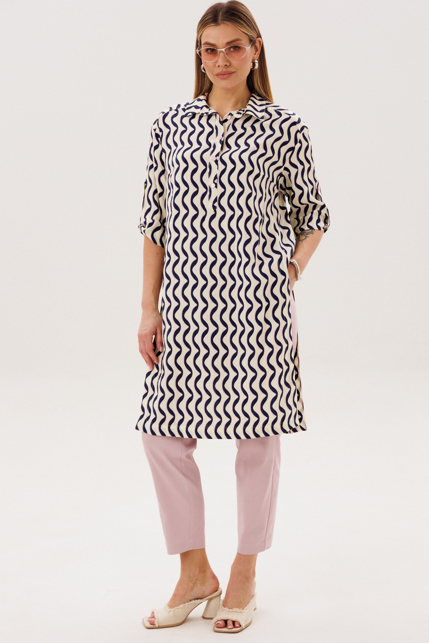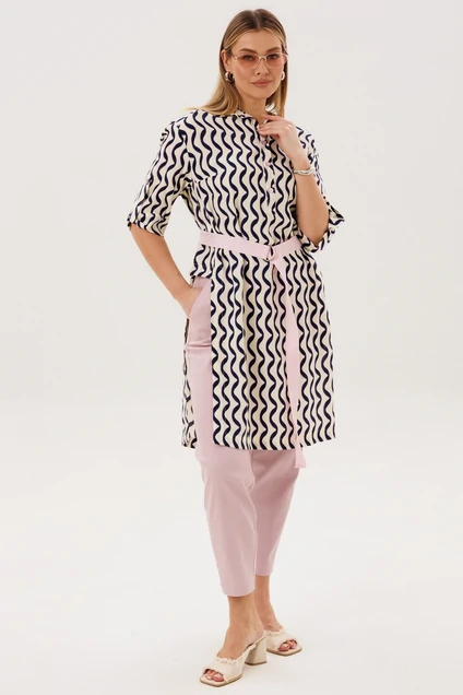 Костюм брючный 5133 FantaziaMod — это универсальный комплект из удлиненной туники и брюк, который станет отличным выбором для повседневного гардероба. Коллекция бренда FantaziaMod предлагает комфорт и стиль в каждом элементе. Туника из вискозного материала с нейлоном обеспечивает воздухопроницаемость и гигроскопичность, делая её идеальной для теплого сезона. Оригинальный фасон с рубашечным воротником и бантовой складкой на спинке добавляет изюминку образу. Брюки с зауженными к низу штанинами и эластичным поясом на спинке обеспечивают удобную посадку. Наклонные карманы на бёдрах добавляют функциональности. Элегантный тёмно-синий узор на тунике и нейтральные брюки делают этот комплект идеальным выбором для прогулок и работы.