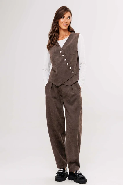 Костюм с жилетом - прекрасное решение для смелых экспериментов. Жилет полуприлегающего силуэта с асимметричной застёжкой, фигурной линией низа и регулирующийся кулисе по спинке. Полочки с отрезным бочком и нагрудными вытачками, спинки - с центральным швом, отрезным бочком и регулирующийся кулисой с фиксаторами. Брюки "баррел" на притачном поясе со шлёвками (эластичном в области спинки), с наклонными карманами , мягкими складками защипами по верху брюк и вытачками по низу. Джемпер трикотажный, с длинным рукавом, полуприлегающего силуэта.