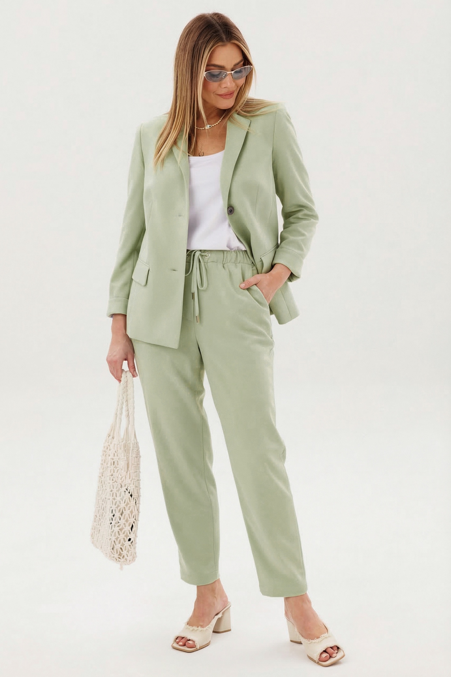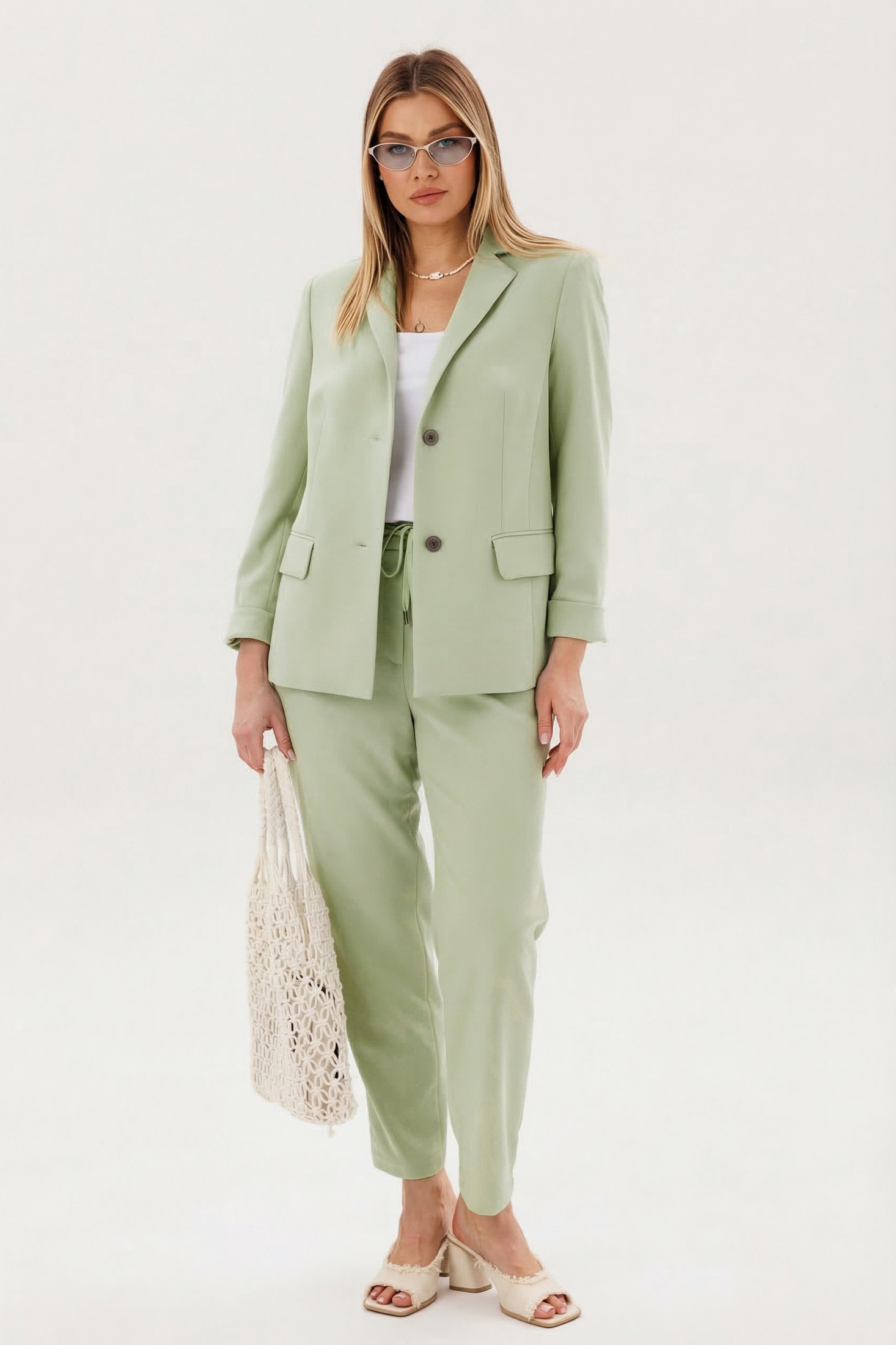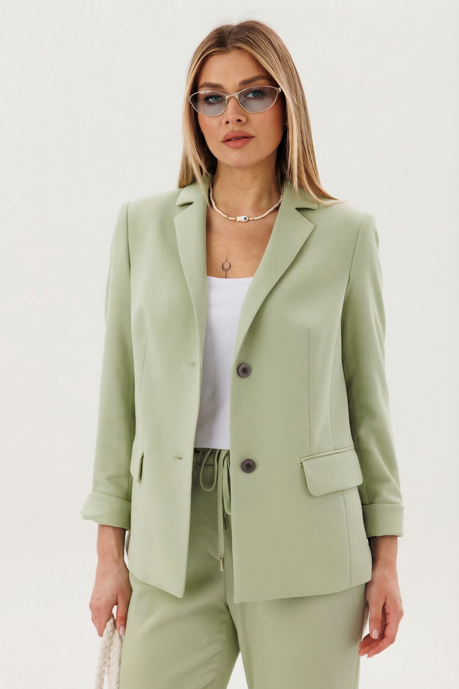 Костюм брючный 5421 фисташка FantaziaMod. Коллекция бренда FantaziaMod предлагает изысканный брючный костюм, который станет отличным выбором для стильных и уверенных женщин. Изготовленный из полиэстера, вискозы и спандекса, он обеспечивает комфорт и эластичность, идеально подходя для весенне-летних дней. В комплекте пиджак свободного силуэта с классическим английским воротником и застежкой на две петли, а также брюки на эластичном поясе с люверсами и отделочным шнуром. Карманы с клапанами и прорезные карманы добавляют функциональности. Цвет костюма — нежный фисташковый, подчеркивающий вашу индивидуальность. Длина пиджака около 67 см, длина рукава 60 см, длина брюк 98 см. Этот костюм идеален для офисных встреч и деловых мероприятий.