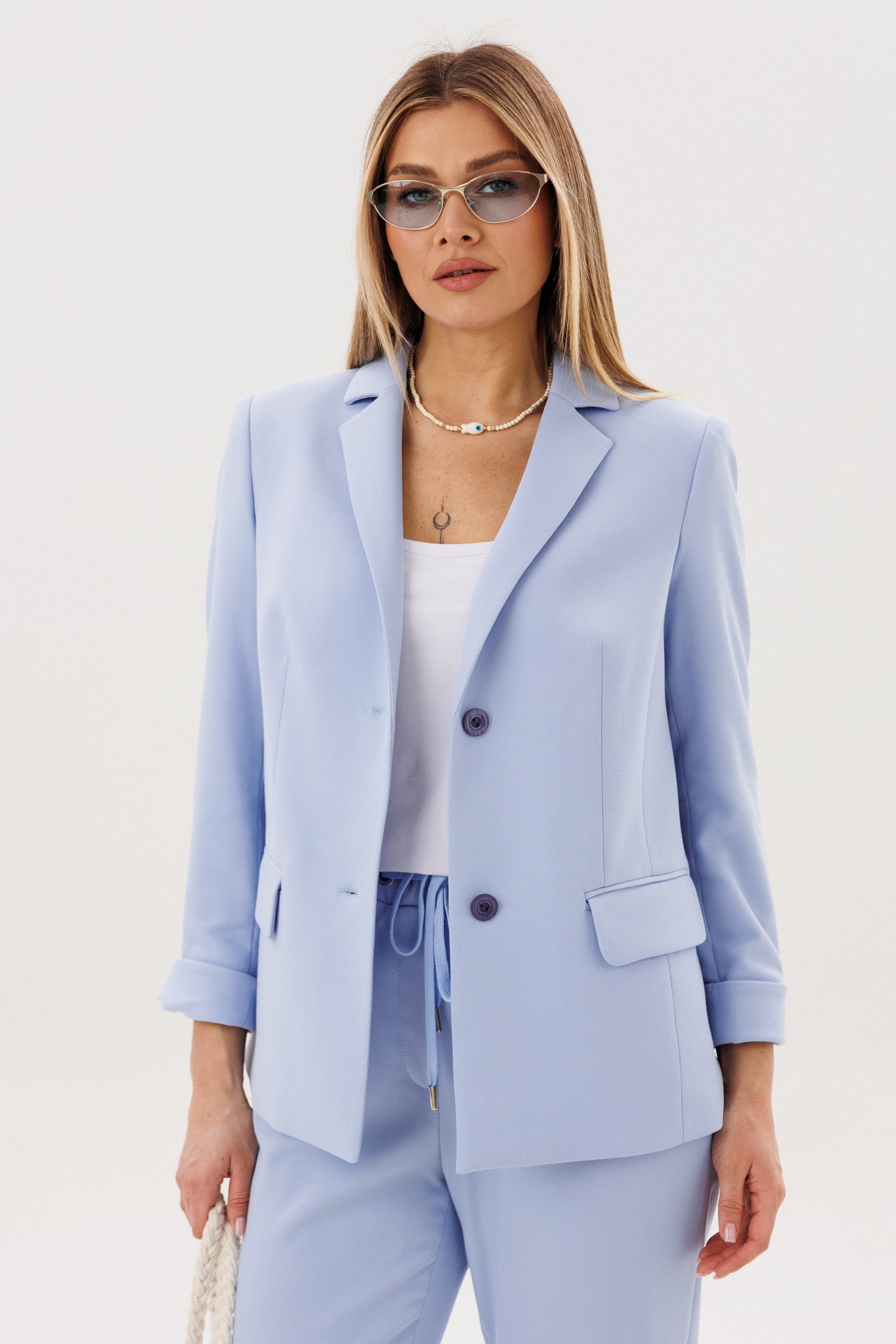 Костюм брючный 5421 голубой FantaziaMod — выбор для уверенных и стильных женщин. Коллекция бренда FantaziaMod сочетает в себе комфорт и безупречный стиль. Изготовлен из полиэстера, вискозы и спандекса, костюм обеспечивает удобство и лёгкость в носке. Свободный силуэт и классический английский воротник подчеркивают изысканность образа. Пиджак достигает длины около 67 см, а рукав — 60 см, что идеально для офиса. Модель оснащена застёжкой на пуговицы и декоративными элементами, такими как отрезной бочок и прорезные карманы. Брюки на эластичном поясе добавляют удобства, их длина составляет около 98 см. Голубой цвет освежает и подходит для теплых сезонов. Этот костюм станет вашим незаменимым спутником в деловых и повседневных образах.