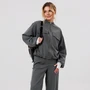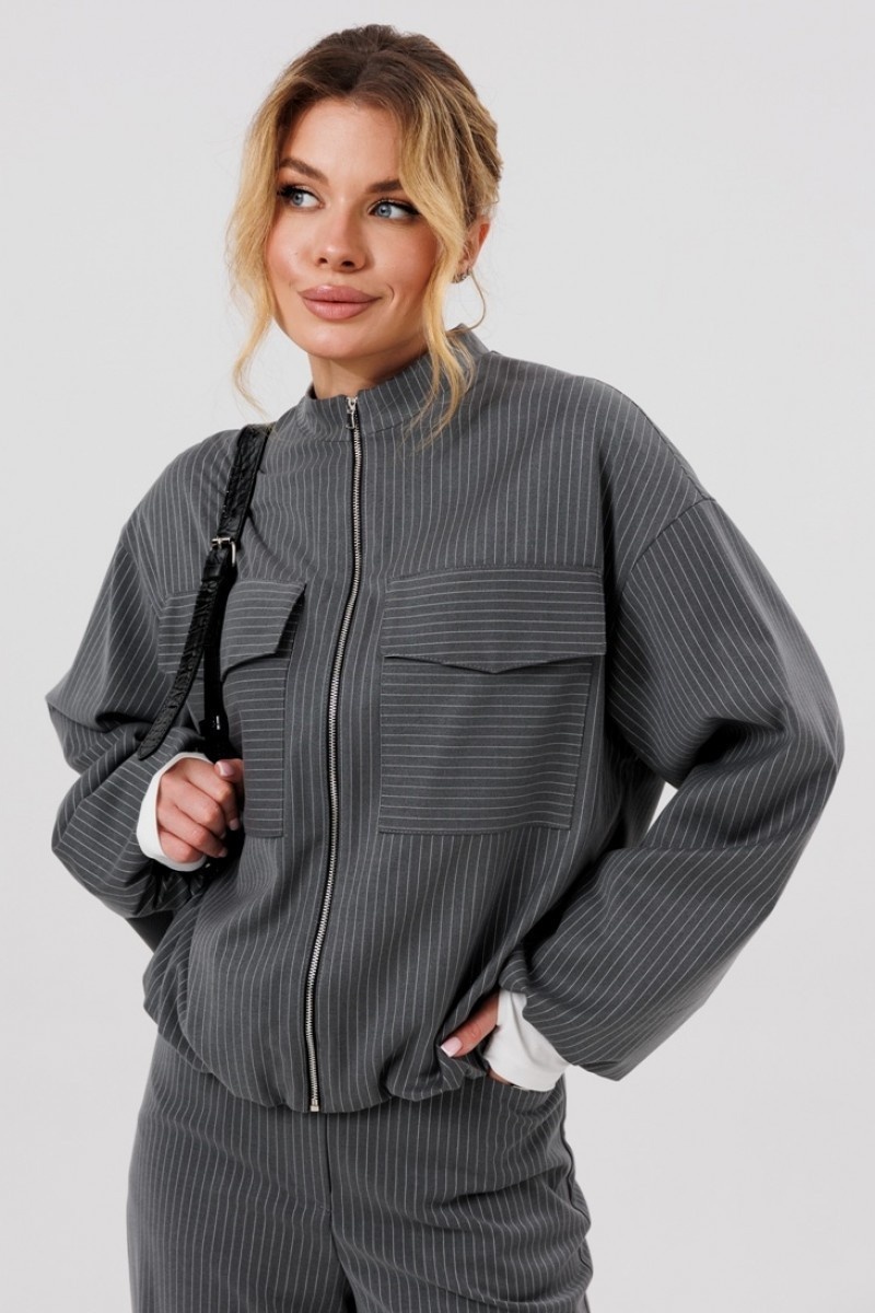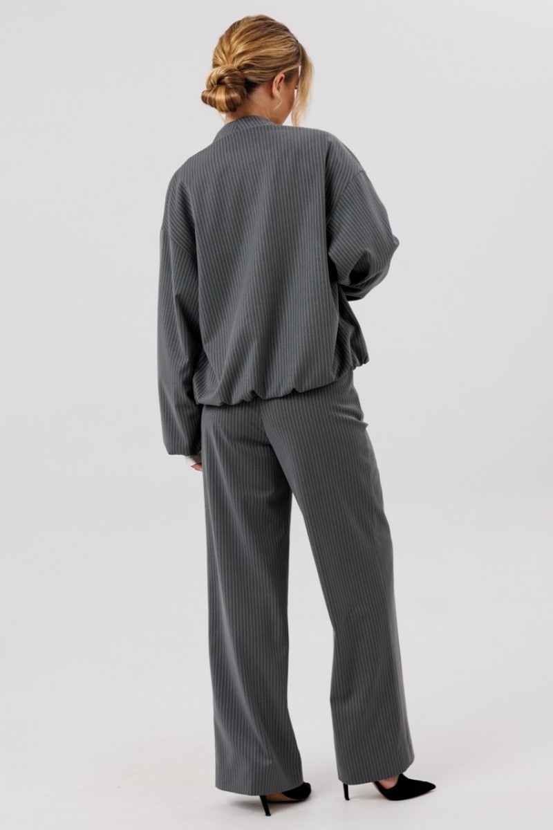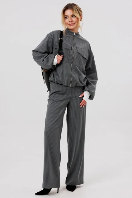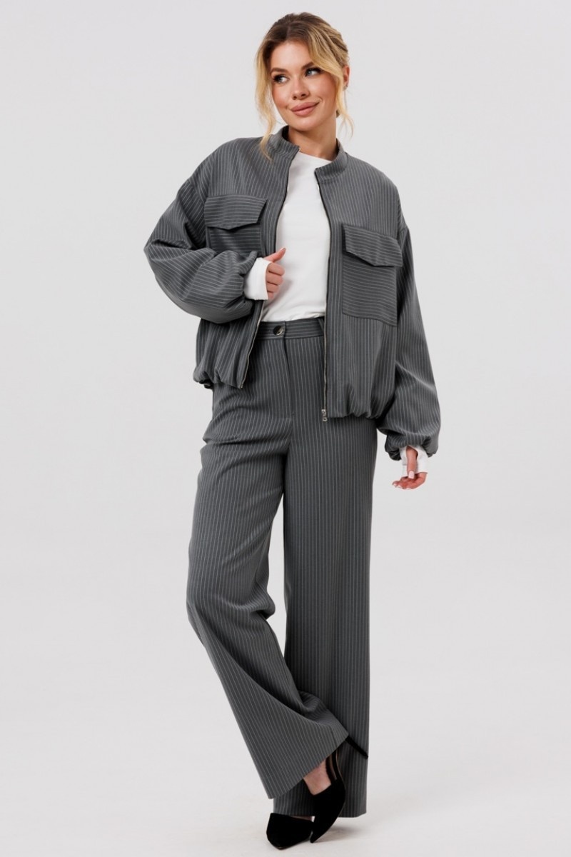Элегантный женский костюм в сером оттенке с тонкой белой полоской, создающий классический и современный вид. Комплект включает стильный бомбер на подкладке и прямые брюки, которые слегка расклешены к низу. Жакет оснащен удобной застежкой-молнией и дополнен объемными рукавами, добавляющими современный акцент. Брюки с частично резиновым поясом обеспечивают комфортное прилегание. Выполненный из высококачественной костюмной ткани, этот костюм идеально подходит для создания роскошного делового образа.