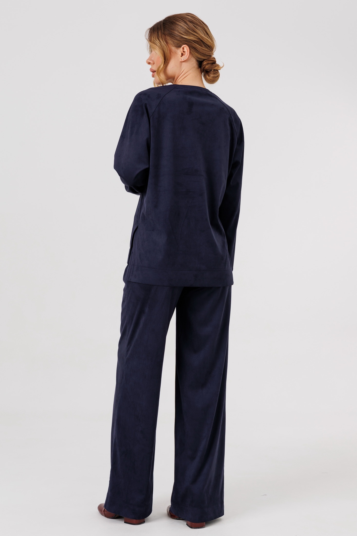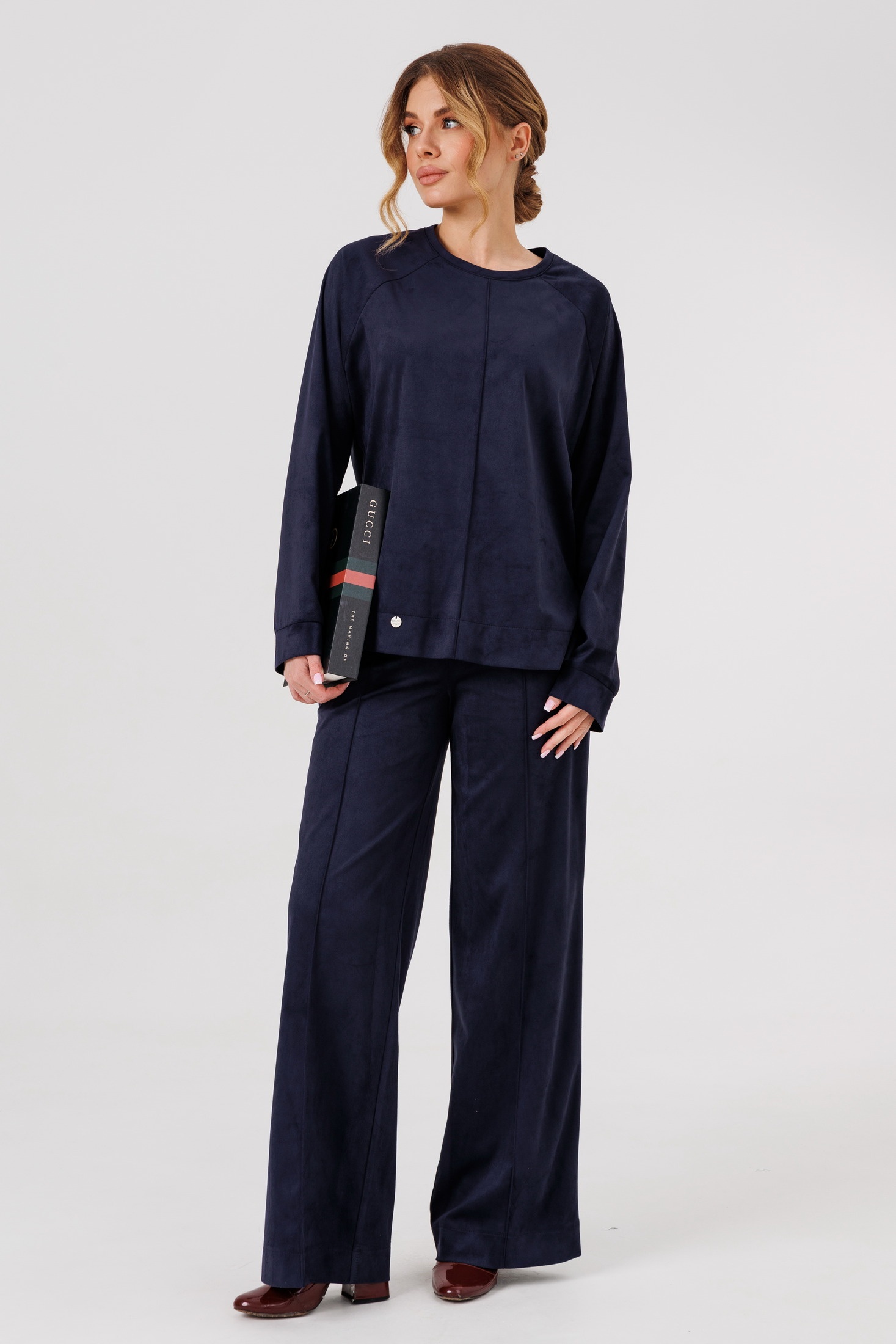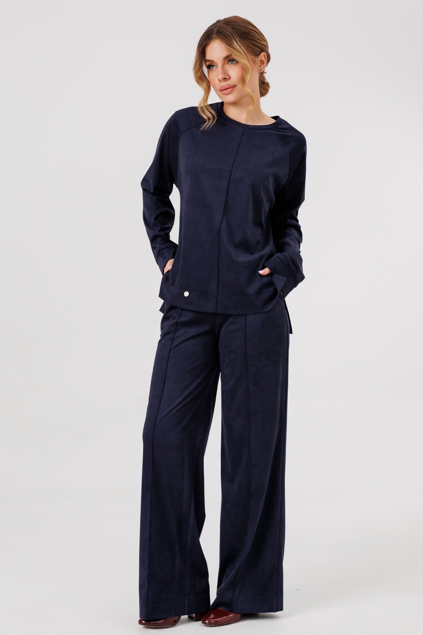 Костюм брючный 1581-1 синий Faufilure — это стильный выбор для любого времени года. Коллекция бренда Faufilure сочетает в себе комфорт и элегантность, предлагая комплект из ткани под замшу, которая добавляет мягкости и глубину цвета. Округлый вырез горловины и свободный силуэт делают костюм универсальным для повседневного ношения. Брюки с карманами обеспечивают дополнительное удобство. Темно-синий цвет костюма удачно подходит для делового или офисного стиля, что делает его актуальным и для зимнего прогулочного назначения.