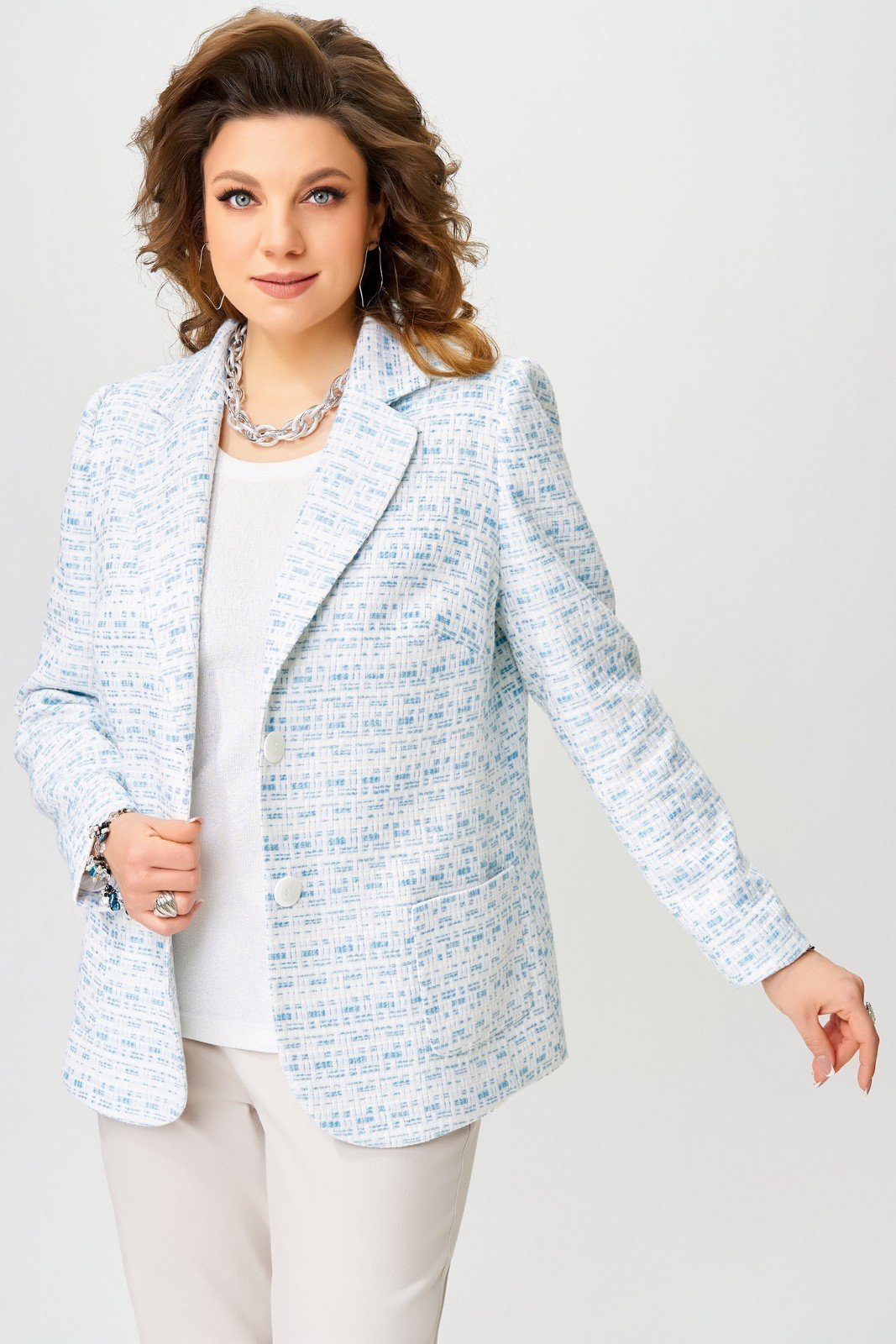 Жакет выполнен из хлопковой плотной ткани, рисунок в виде плетеной корзинки. Жакет на подкладке полуприлегающего силуэта, воротник отложной, по борту лацканы, низ борта закругленный, застежка однобортная на две пуговицы. По полочке - рельеф и накладной карман. По спинке - рельефы, рукав втачной двухшовный. Жакет нарядный отличный вариант для праздников и повседневной носки.