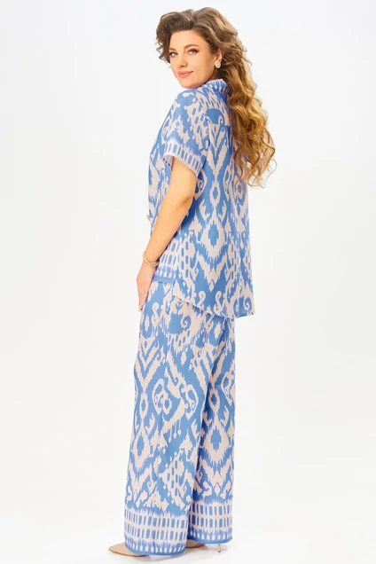 Комплект брючный двойка "Милица" состоит из блузки и брюк. Брючный костюм выполнен из льняной ткани и рисунком самовары. Блузка прямого силуэта, застежка однобортная, на петли и пуговицы, воротник отложной с лацканами пиджачного типа, по полочке - нагрудная выточка. В блузке ручав втачной одношовный, низ рукава обработан швом в подгибку с закрытым срезом. В боковых швах - разрезы, низ блузки обработан швом в подгибку с открытым срезом.