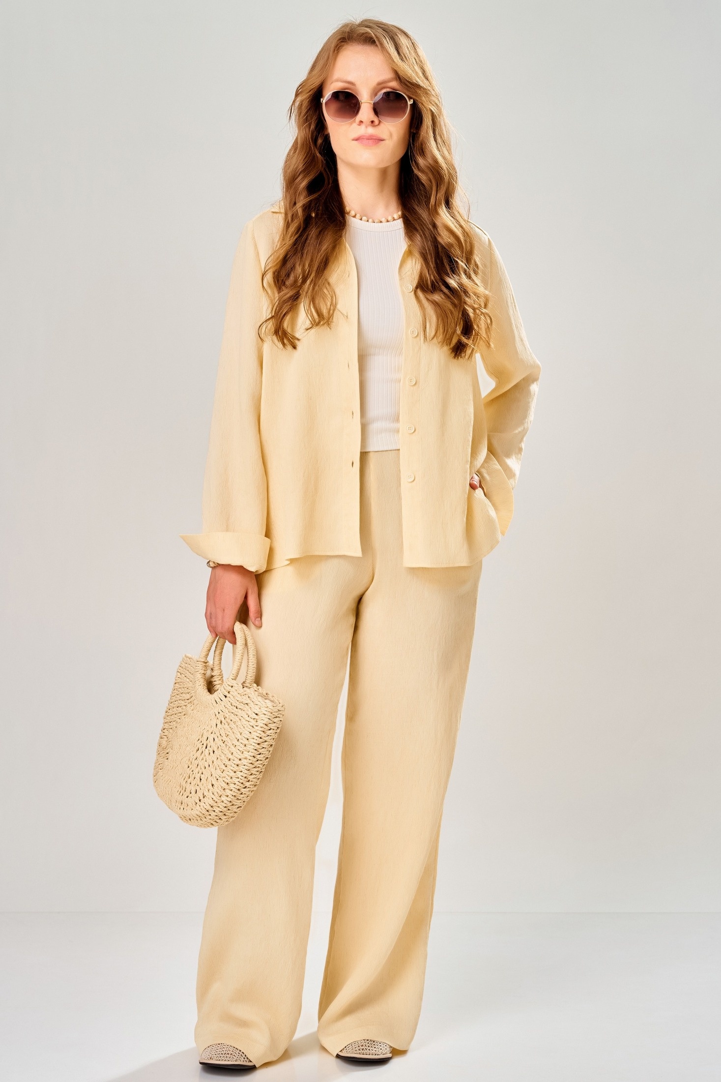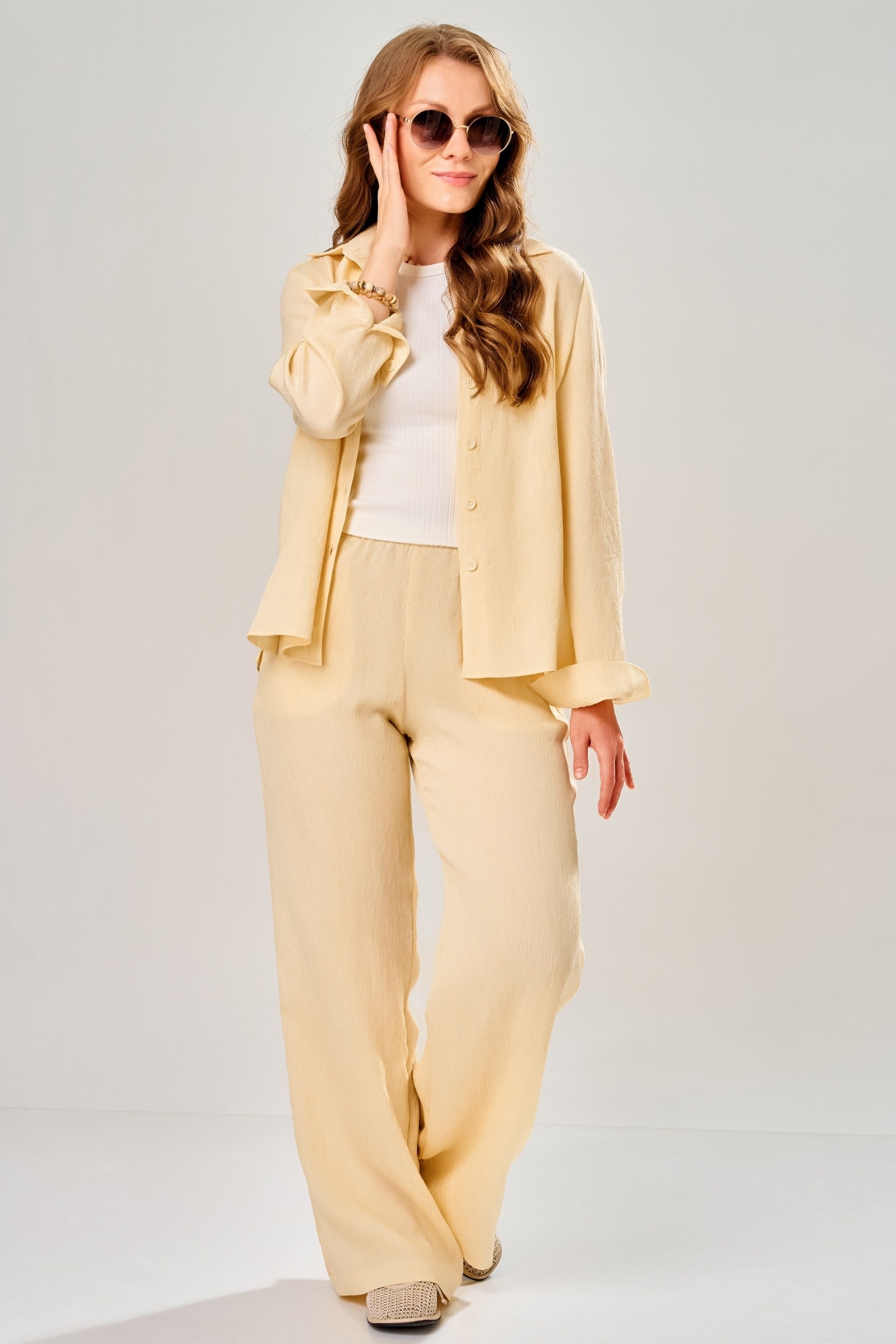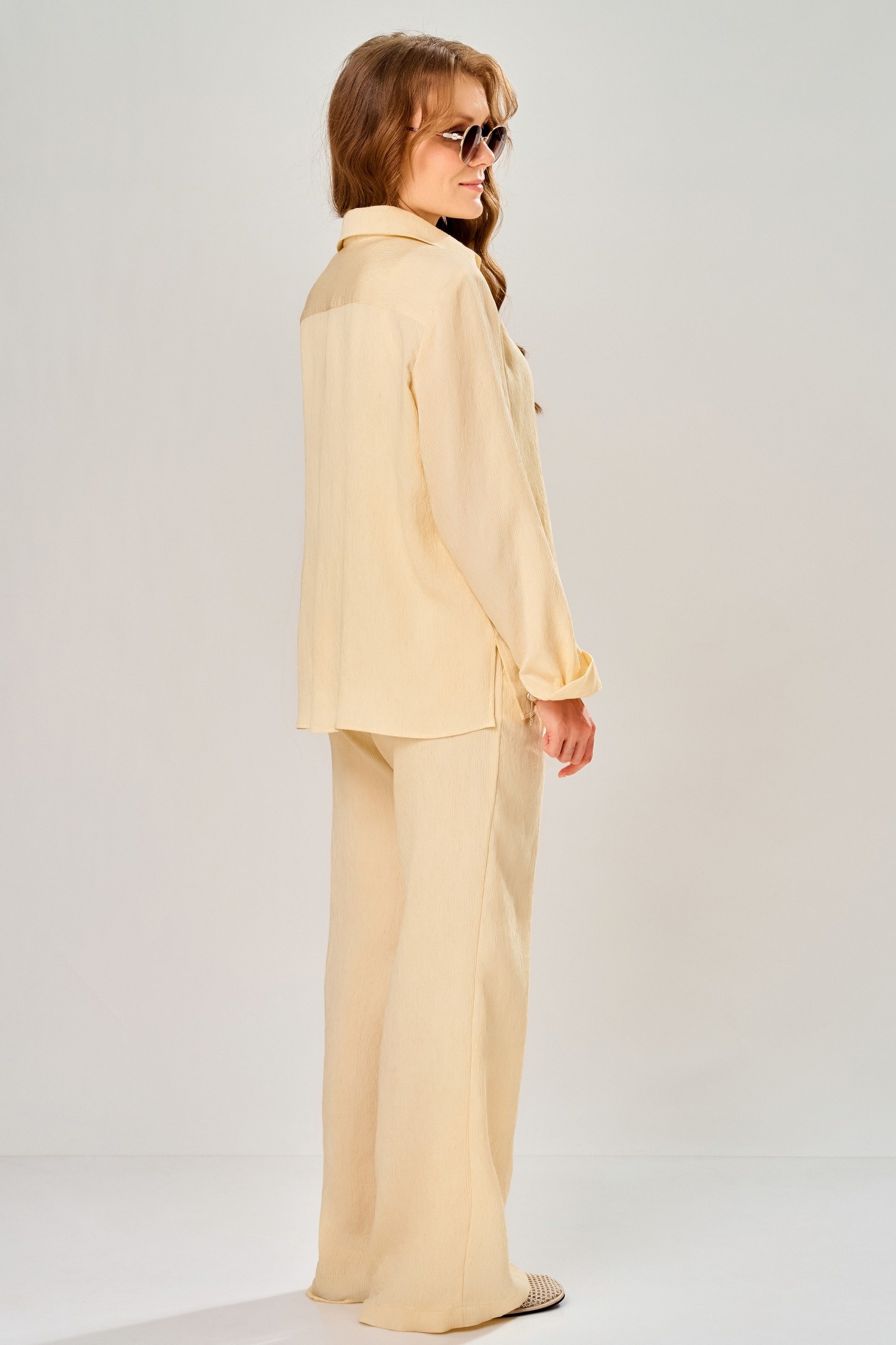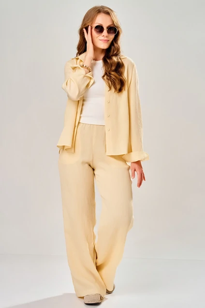 Костюм брючный 3311 солнечный луч FITA представляет собой универсальный женский комплект из бренда FITA. Коллекция бренда предлагает стильный и комфортный брючный комплект из текстильной ткани 'Нотус', состоящий из брюк и рубашки. Материал сочетает в себе натуральные волокна хлопка и льна с добавлением нейлона для создания эффекта легких полосочек. Рубашка прямого силуэта, с удобной однобортной застежкой на петли и пуговицы и классическим воротником на стойке. Брюки свободного прямого фасона оснащены цельнокроеным поясом на резинке и боковыми карманами. Летний комплект особенно выделяет солнечный желтый оттенок, идеально подчеркивающий легкость и элегантность образа в теплый сезон. Подойдет как для повседневных прогулок, так и для более официальных мероприятий.