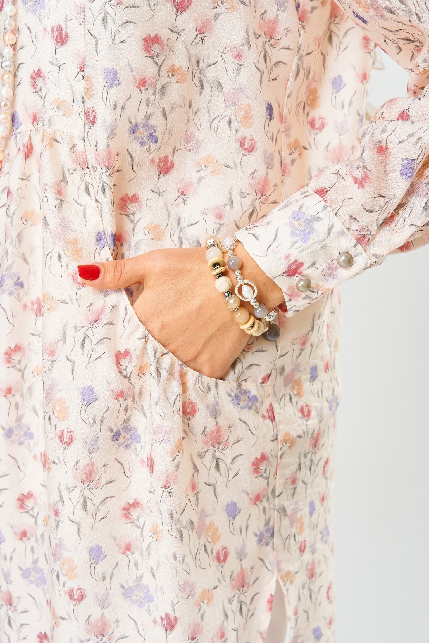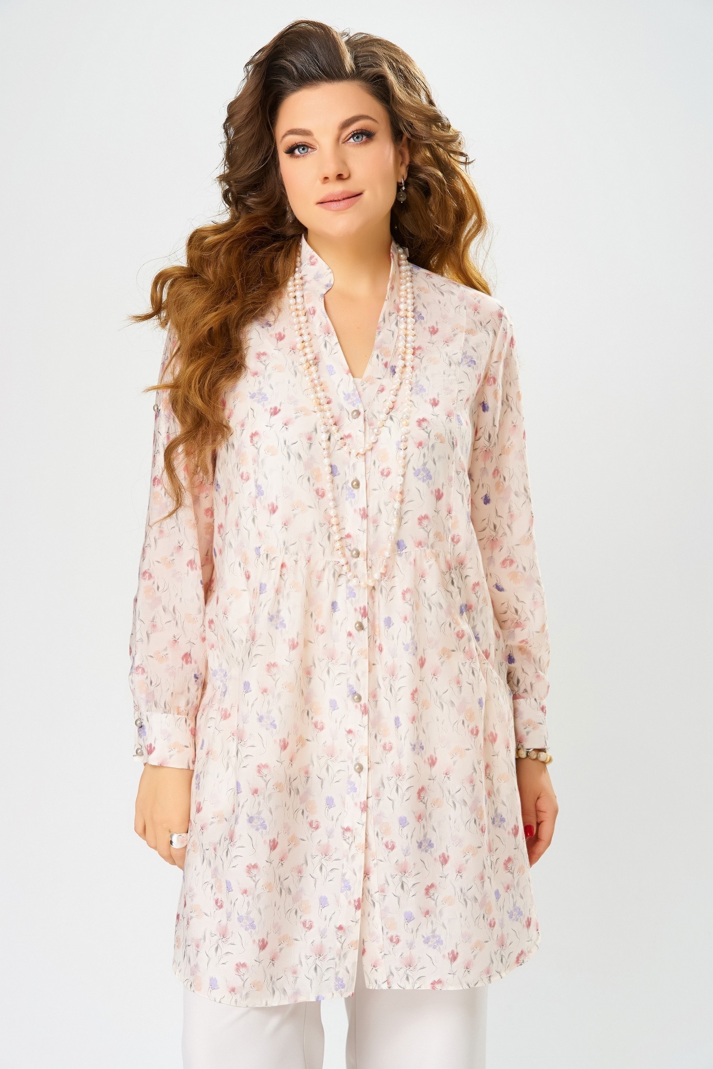 Туника из воздушной ткани «Вуаль» очаровывает нежным цветочным принтом и легкостью. Ее прямой силуэт дарит свободу движений, а слегка прозрачная структура добавляет загадочности и романтичности. Длинные рукава с притачной манжетой и застежкой на пуговицы позволяют регулировать длину, создавая вариативность образа. Фигурный вырез горловины с отрезными планками и воротник-стойка придают тунике особый шарм, а фигурные карманы со сборкой на передней части добавляют стильные акценты. Изящные складки в области талии формируют женственный силуэт, а фигурный низ с боковыми разрезами придает легкость движений.