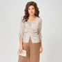 Нарядная блузка выполнена из мягкой трикотажной сетки в пайетки. Блузка полуприлегающего силуэта с драпировкой по полочке. Горловина в блузке v-образной формы, по низу разрез. Рукава в блузке втачные, одношовные, по низу рукава две декоративных складки. Низ изделия и низ рукавов обработаны бейкой, застроченной на 0,7 мм.