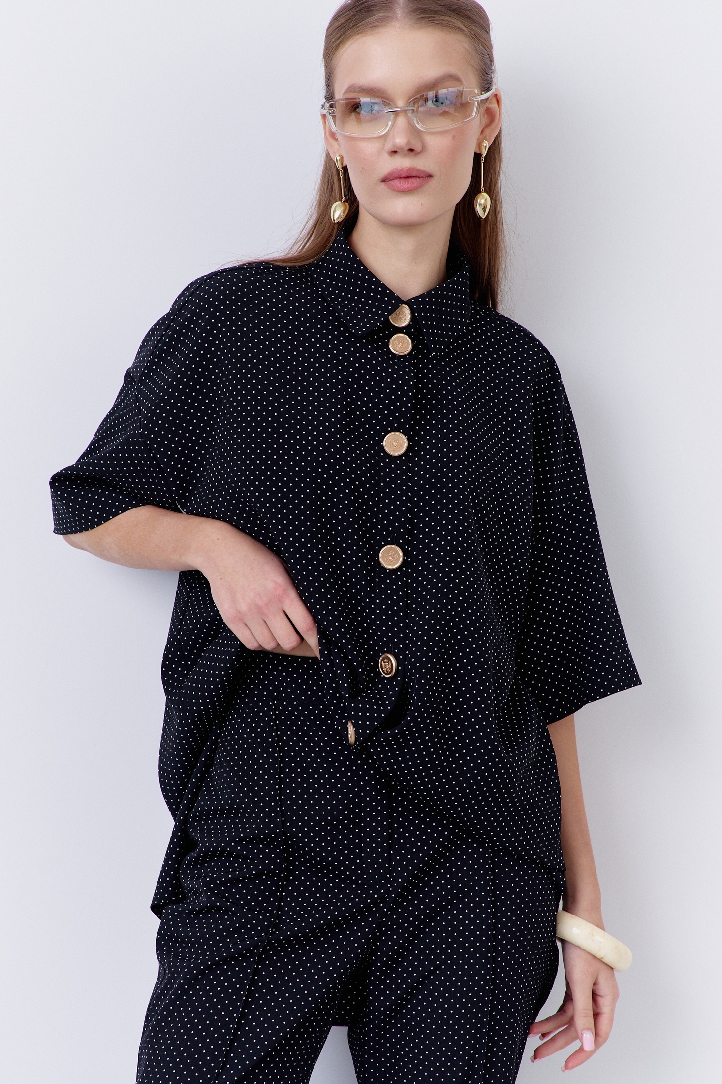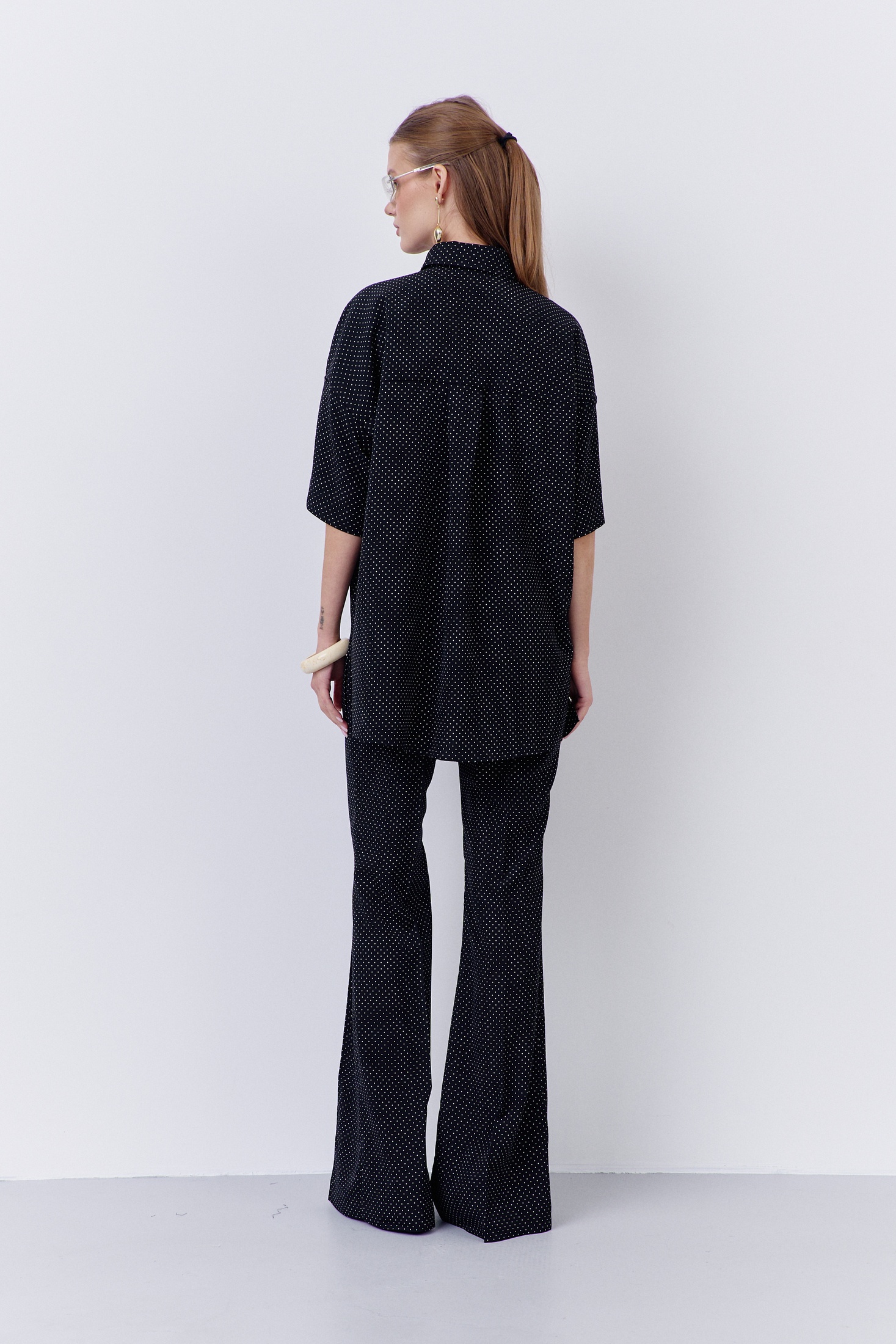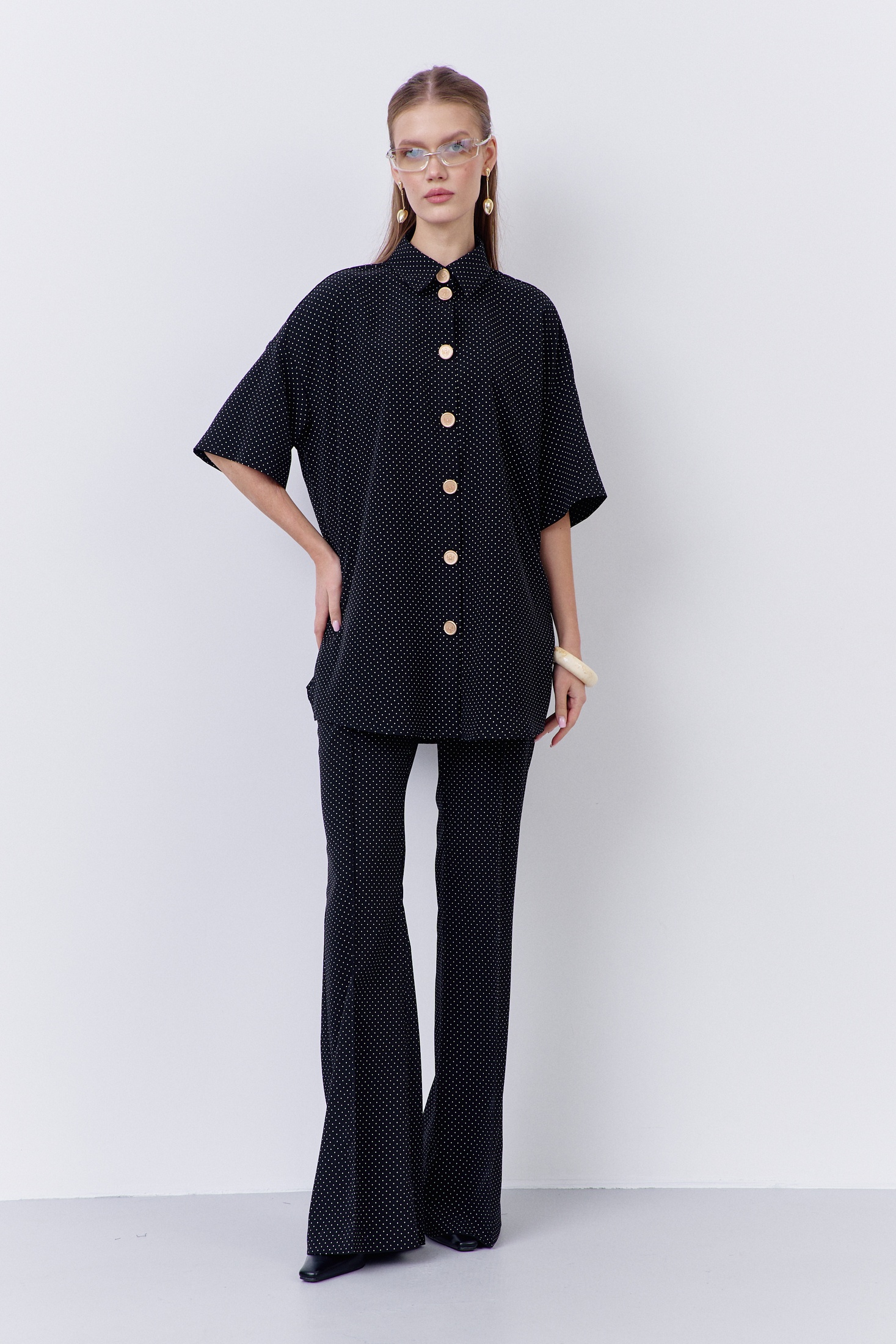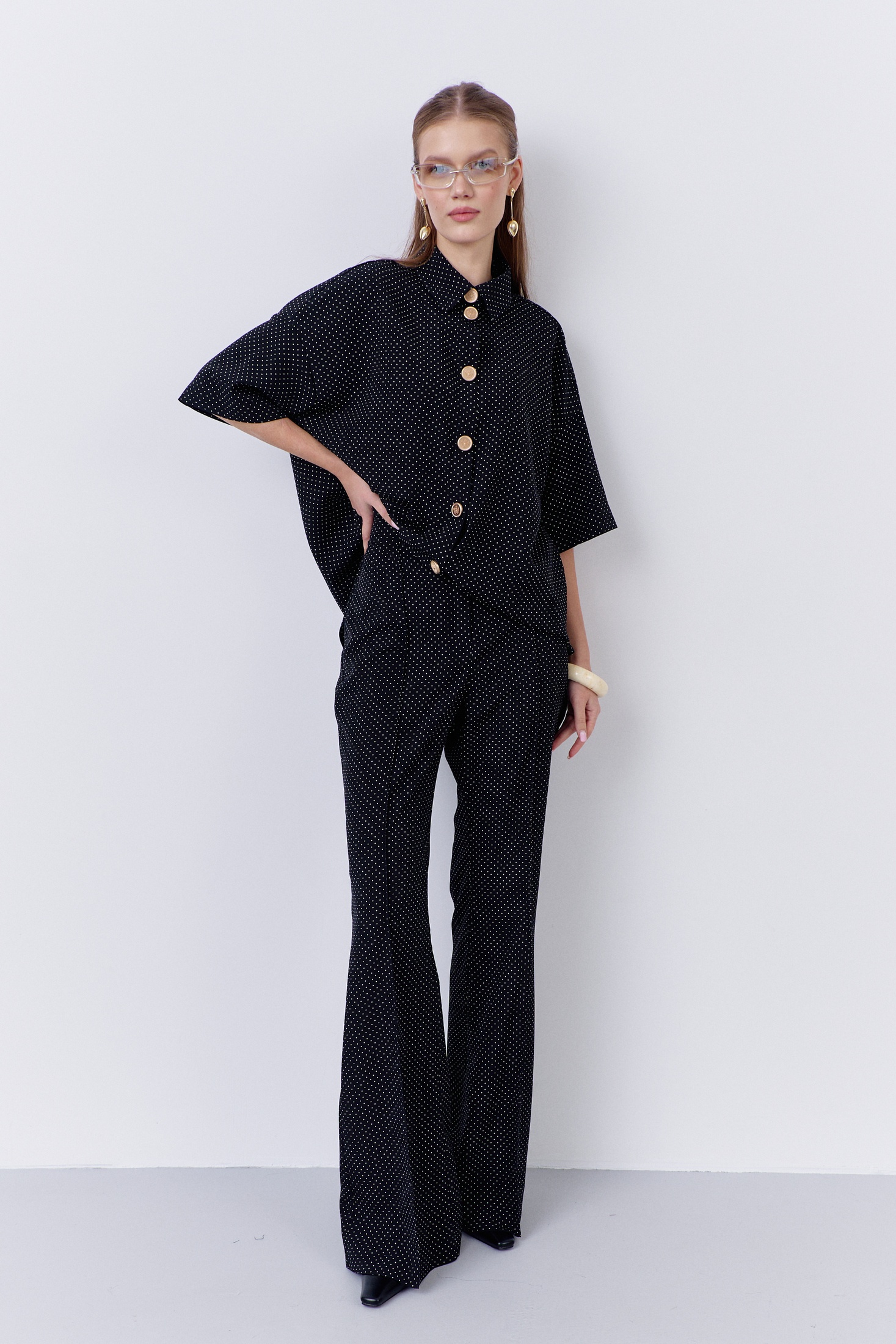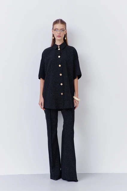 Костюм брючный 2068 черный горох FLAIM. Этот стильный комплект из коллекции бренда FLAIM включает в себя блузку свободного силуэта и брюки-клеш. Изготовленный из плательной ткани с принтом черного гороха, он подходит для повседневной и офисной носки. Блузка оснащена центральной застежкой на петли с декоративными пуговицами. Брюки-клеш облегают фигуру, придавая ей элегантность. Материал сочетает в себе полиэстер, вискозу и эластан, обеспечивая комфорт и легкость. Черный цвет в сочетании с узором в горох делает костюм универсальным для различных сезонов и поводов.