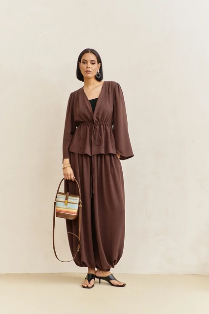 Костюм брючный 2100 коричневый FLAIM — стильный выбор для вашего гардероба. Коллекция бренда FLAIM предлагает комплект из полуприталенной блузки с кулисой по талии и свободных брюк-аладинов. Изделие выполнено из костюмно-плательной ткани с преобладанием вискозы, что гарантирует мягкость и комфорт. Блузка декорирована бусинами, добавляя нотку оригинальности. Пояс брюк на резинке обеспечивает удобную посадку, а боковые карманы — практичность. Этот костюм прекрасно подойдет для осенних и весенних прогулок, предлагая комфорт в прохладную погоду. Коричневый цвет делает его универсальным для различных случаев.