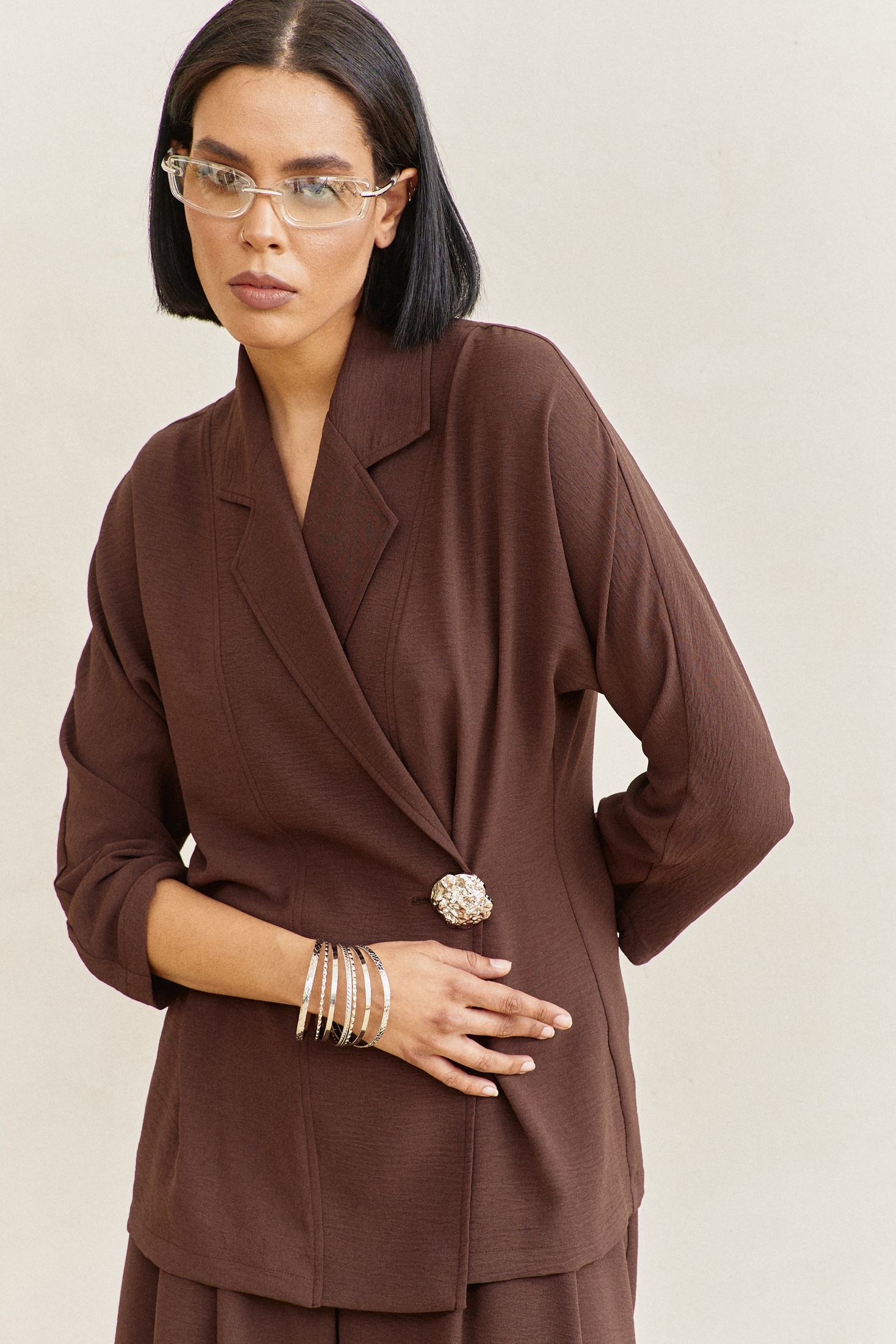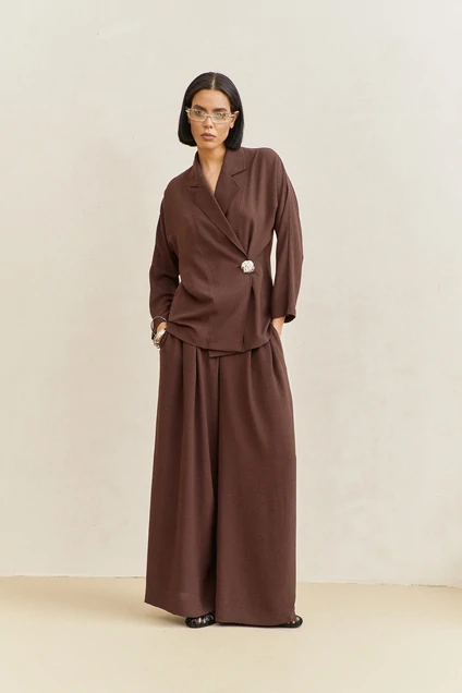 Костюм брючный 2115 коричневый FLAIM — это стильный вариант из коллекции бренда FLAIM для осеннего сезона. Он выполнен из комфортной вискозной ткани с добавлением полиэстера и эластана, что обеспечивает мягкость и эластичность. Жакет полуприталенного силуэта с необычной смещенной застежкой и пиджачным воротником дополняется свободными брюками-палаццо. Пояс брюк на резинке и боковые карманы обеспечивают удобство ношения. Костюм представлен в универсальном коричневом цвете, что делает его идеальным для повседневного и офисного стиля. Благодаря своим характеристикам, это отличный выбор для прогулок и работы в прохладную погоду.