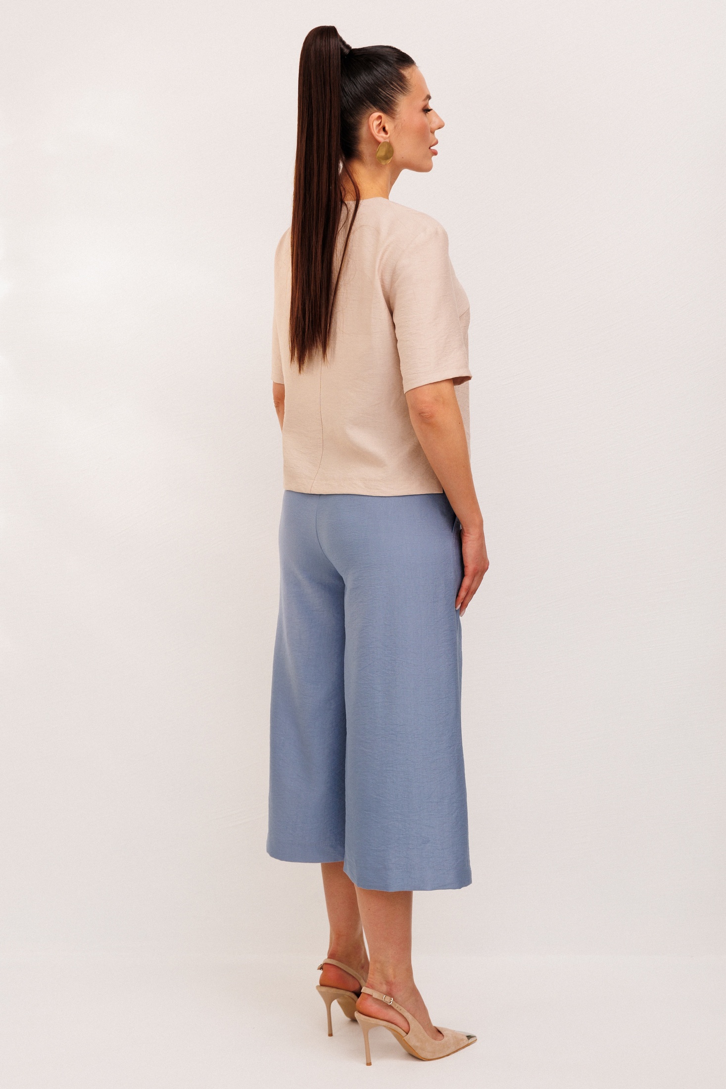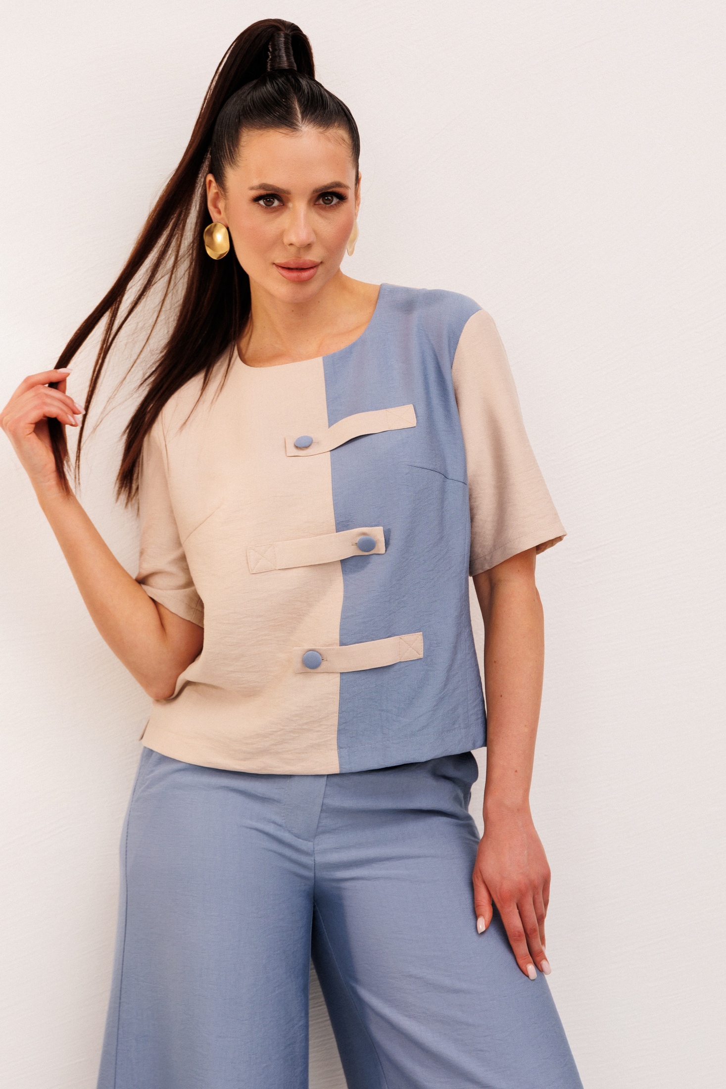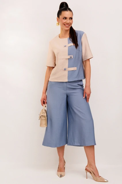 Костюм брючный 1007 Галеан Стиль от белорусского бренда - идеальный выбор для летнего сезона. Коллекция бренда предлагается в стиле повседневной элегантности. Костюм изготовлен из натуральной вискозы, что придаёт изделиям легкость и комфорт в жаркую погоду. Блузка прямого силуэта выполнена из двухцветной ткани с декоративными настроченными элементами на пуговицах. Брюки-кюлоты длиной до середины икры обеспечивают комфорт при движении, оснащены гульфиком на молнии, а также задней резинкой для идеальной посадки. Цветовая гамма включает нежные голубые и кремовые тона, создающие спокойное и стильное впечатление. Боковые карманы добавляют функциональности и удобства, делая костюм практичным для повседневного использования.