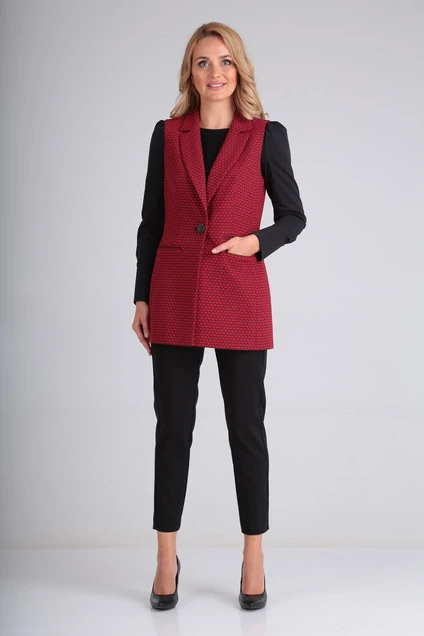 Комплект 3-х предметный. Жилет на подкладе. Застежка центральная на одну петлю-пуговицу. На полочках двапрорезных функциональных кармана один карман обманка. Блуза трикотажная с рукавами из хлопка со стрейчем, низ рукава на манжете. Брюки верхний срез на поясе - обтачное, посадка средняя. Длина блузы -54см, длина рукава - 62см брюки: хл-95% лайкра-5%; блуза: вискоза-100%