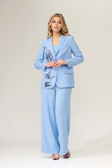 Костюм состоит из жакета, топа и брюк. Жакет полуприлегающего силуэта с однобортной застежкой на две петли и пуговицы и воротником пиджачного типа. Борт закругленый. Перед с талиевой вытачкой  и настрочными клапанами. Спинка с рельефом и средним швом. Рукав втачной двухшовный. Жакет на подкладке. Топ прилегающего силуэта. Перед отрезной по линии лифа, с рельефами. Спинка со средним швом и рельефами. В боковом шве застежка на потайную молнию. Топ на подкладке. Брюки расширенные книзу с притачным поясом. В боковых частях пояса вставлены резинки. По передней и задней частям брюк вытачки. По переду застежка на молнию и гульфик и петлю и пуговицу на поясе. Длина жакета см- 72 см, длина рукава жакета - 61 см , длина топа по спинке -28 см, длина брюк по боковому шву без учета пояса- 108 см.Рост 170