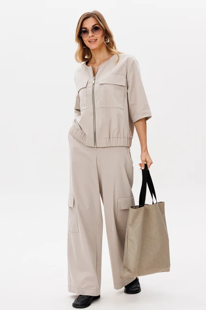 Костюм брючный 5287 светло-серый GIZART. Коллекция бренда GIZART предлагает стильный брючный костюм, выполненный из качественной джинсовой ткани, состоящей из 72% хлопка, 26% полиэстера и 2% эластана. Жакет с застежкой на молнию и вместительными карманами на клапанах по переду придает образу функциональности. Рукава втачные одношовные, а низ жакета собран на планку с резинкой, что обеспечивает комфорт и стиль. Брюки расширены книзу, с притачным поясом на резинке и накладными карманами, создающими современный повседневный стиль. Светло-серый цвет костюма делает его универсальным и подходящим для весенне-летнего сезона.